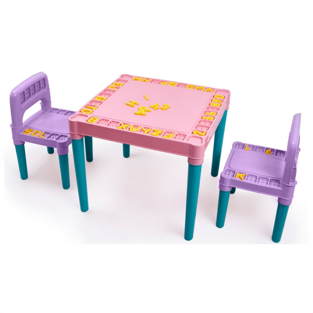O anúncio contém: 01 Mesa, 02 Cadeiras, 26 Letras do Alfabeto, 10 Numerais. Muito simples de montar e desmontar, podendo ser guardada logo após a brincadeira, sem ocupar um espaço desnecessário. Produto confeccionado em plástico resistente, com pés de perfeito encaixe, que dá ao produto firmeza e sustentação durante o uso. O tampo da mesa e as cadeirinhas possui espaços para encaixar letrinhas, números, apoio de copo, giz de cera, estimulando o aprendizado de forma lúdica. Pode ser utilizado brincar e fazer suas atividades, tomar um lanche ou até fazer uma refeição; Benefício: Estimula as habilidades psicomotoras, criatividade e imaginação das crianças. Auxiliando no aprendizado dos números e das letras. Informações: Faixa etária: A partir de 3 anos Dimensões aproximadas da mesa: 44cm x 51cm x 51cm Dimensões aproximadas da cadeira: 45cm x 27cm x 29cm Dimensões aproximadas do assento da cadeira: 26cm x 28cm Dimensões aproximadas do encosto (AxL): 16cm x 27cm Peso máximo suportado pela cadeira: 25 kg Material: Plástico resistente Certificação: INMETRO Fabricante: Tritec ATENÇÃO: O produto acompanha 36 peças sendo 26 do alfabeto e 10 numerais, as imagens apresentam apenas a forma em que as letras podem ser aplicadas, a quantidade de letras e números não completa todos os espaços. As cores do produto podem variar de acordo com o lote de fabricação e imagem apresentada. A mesa e as duas cadeiras possuem pés e encosto coloridos e as letras e números são amarelos. Imagens meramente ilustrativas. - Produto novo e em estoque - As cores do tecido ou produto podem variar de acordo com o lote de fabricação. - Todos os produtos têm seguro contra extravio
