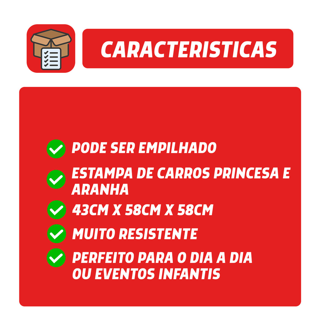 🎨 MESA INFANTIL ESTAMPADA | Diversão, Segurança e Praticidade em um Só Lugar! Transforme o cantinho das crianças com uma mesa infantil lúdica, colorida e funcional, feita especialmente para os pequenos explorarem a criatividade com conforto e segurança! Seja para brincar, desenhar, fazer tarefas ou usar em festinhas temáticas, a Mesa Infantil Estampada é perfeita para proporcionar momentos alegres e seguros 🌈✨ Com estampas vibrantes dos personagens favoritos — Carros 🚗, Princesas 👑 e Aranha 🕷️ —, essa mesinha atrai a atenção das crianças, contribuindo para um ambiente mais estimulante e organizado. Além disso, é leve, resistente e fácil de empilhar, ideal para escolas, festas e uso doméstico! 🛠️ Características do Produto ✔️ Material: Plástico PP injetado reforçado — resistente e 100% atóxico 👶 ✔️ Dimensões: 43 cm (A) × 58 cm (L) × 58 cm (P) 📏 ✔️ Estampas disponíveis: 🚗 Carros 👑 Princesas 🕷️ Aranha ✔️ Cores: Variam conforme a estampa escolhida ✔️ Superfície lisa — fácil de limpar com pano úmido ✔️ Estrutura empilhável — até 5 unidades sem ocupar espaço ✔️ Ideal para crianças a partir de 2 anos com supervisão ✅ Leve e prática: transporte e montagem sem esforço ✅ Estampa resistente e de alta qualidade visual ✅ Uso interno ou em áreas cobertas 📦 Você vai receber em sua casa: 📌 1x Mesa Infantil Estampada – no tema e cor de sua escolha 📌 Produto embalado com proteção extra para evitar riscos 📌 Nota Fiscal eletrônica emitida (CPF ou CNPJ) 📌 Envio em até 24 horas úteis após confirmação do pagamento 📌 Inspeção de qualidade individual antes da expedição 📋 Recomendações de Uso 👶 Indicada para brincadeiras, atividades escolares, refeições e festas 🧽 Limpeza fácil: utilize apenas pano úmido e sabão neutro ☀️ Evite exposição direta e prolongada ao sol para preservar a cor ⚠️ Não usar produtos químicos abrasivos 📐 Empilhar no máximo 5 unidades para garantir estabilidade 🧩 Usar sob supervisão de um adulto, especialmente com crianças pequenas 🔍 Verifique se há rachaduras ou deformações antes do uso — segurança em primeiro lugar! ✨ Traga mais cor, segurança e alegria para o dia a dia das crianças com essa mesinha encantadora, prática e super versátil! Ideal para escolas, creches, residências e espaços de festa 🥳💕