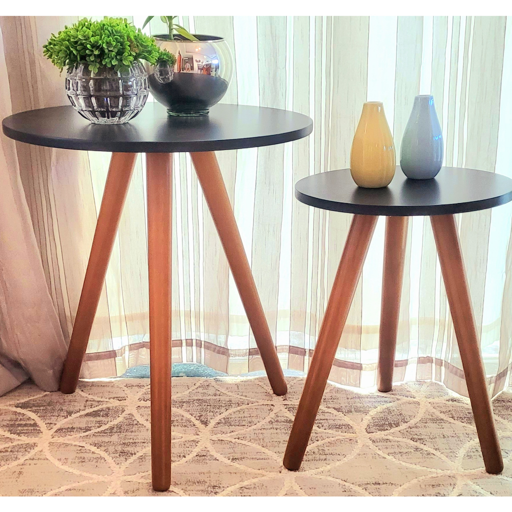Mesa lateral redonda e canto na cor preta Kit com 2 unidades com 3 pé palito na cor amendoa
