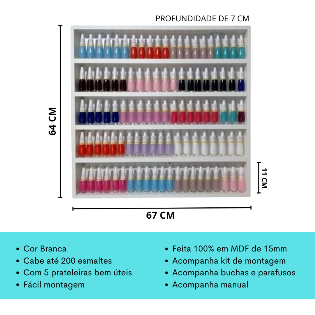KIT 3 ITENS: 1 Mesa Multiuso 1 Nicho Expositor 1 Apoio Para Punho Roxo MEDIDAS DA MESA: - Comprimento: 70 cm - Largura: 30 cm - Altura: 77 cm DESCRIÇÃO DO PRODUTO: - COR: Branca - Mesa em MDF/MDP de 15 mm - Kit de montagem (PARAFUSOS + PÉS DA MESA + TAPA FURO) - Com 1 prateleira bem útil - Bem resistente e não balança - Suporta até 20 Kg ------------------------------------------------------------- MEDIDAS DO EXPOSITOR: - Altura: 64 cm - Largura: 7 cm - Comprimento: 67 cm DESCRIÇÃO DO EXPOSITOR: - Acompanha suporte de fixação, parafusos e buchas. - Com 5 prateleiras para 200 esmaltes. - Fabricado em MDP/MDF de 15 mm. - Suporta até 30 Kg. - Branco ------------------------------------------------------------- MEDIDAS DO APOIO DE PUNHO: - Comprimento: 35 cm - Largura: 15 cm - Altura: 16 cm DESCRIÇÃO DO APOIO DE PUNHO: - Estrutura toda feita em madeira MDF - Estofado feito em Courvin Cipatex (Extremo Resistencia e Conforto) - Espuma D23 (Extremo Conforto) - Costura profissional - Embaixo do apoio cabe uma cabine uv/led. - Utilize o apoio como fundo para suas fotos. Ideal para salão de beleza em geral. Dúvidas Frequentes: 1. Os produtos são enviados desmontados? R. Sim, para evitar danos no transporte nós enviamos os nossos produtos desmontados e devidamente embalados. 2. A montagem é fácil? R. Muito fácil, os nossos produtos podem ser montados apenas com uma simples chave philips, além disso, acompanha manual de montagem, todos os furos já feitos, parafusos e acessórios. 3. O produto está disponível à pronta entrega? R. Todos os nossos produtos são para pronta entrega. 4. O produto é exatamente como o da foto? R. Sim, exatamente igual o da foto! 5. Como são realizadas as entregas? R. As entregas são feitas exclusivamente através do Shopee Xpress que pertence a Shopee. Toda a Responsabilidade da entrega e calculo no valor de frete pertence a Shopee. Ainda tem alguma dúvida? Utilize o campo de perguntas a baixo que responderemos o mais rápido possível. Política de devolução: A nossa política de devolução é bastante flexível, aceitamos devoluções por qualquer motivo em até 07 (sete) dias corridos após o recebimento do seu pedido. A devolução também é válida caso o produto esteja em desacordo com a compra. Garantia: 90 dias contra possíveis defeitos de fabricação.