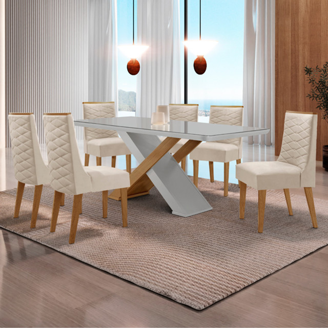 Mesa para Sala de Jantar Carol 180cm MDF Canto Copo com Vidro e 6 Cadeiras Safira A sutileza define perfeitamente a Sala de Jantar Carol com Cadeiras Safira. Produzida em MDF, este conjunto é a símbolo do design moderno e elegante. As Cadeiras Safira oferecem um conforto excepcional com seus assentos e encostos estofados, além de detalhes com bordados tanto na frente quanto atrás do encosto, que realçam a sofisticação do móvel. A mesa, com sua base entrecruzada em dois, destaca-se pelo aspecto contemporâneo e inovador, prometendo encantar seus convidados e transformar suas refeições em ocasiões memoráveis e cheias de estilo. Características: Mesa e Cadeiras Tampo Canto Copo Material da Estrutura: 100 MDF Tipo de Acabamento: Pintura Uv Possui Vidro: Sim Dimensões da Mesa: Altura: 80cm Largura: 180cm Profundidade: 90cm Dimensões das Cadeiras: Altura: 99cm Largura: 45cm Profundidade: 60cm Garantia do Fornecedor: 3 meses Informações Importantes: As tonalidades das cores podem sofrer alteração de acordo com a configuração de cada monitor. Os objetos que ambientam as fotos não acompanham o produto. Não disponibilizamos a montagem do produto. Não nos responsabilizamos por danos no produto causado por montagem. Verifique as dimensões do produto e certifique-se que o percurso que ele fará até o local de uso permite sua passagem. Para mais informações confira as políticas de entrega do site. Favor verificar o produto no ato da entrega e em caso de problemas decorrentes no transporte (arranhados, quebra, batida, amassados) deve-se efetuar a ressalva na nota fiscal para conhecimento da transportadora e comunicar imediatamente a loja. Moderna Mobília reserva o direito de alterar as especificações técnicas sem prévio aviso. As medidas contidas no site podem sofrer variações de acordo com a montagem, tipo de costura etc.
