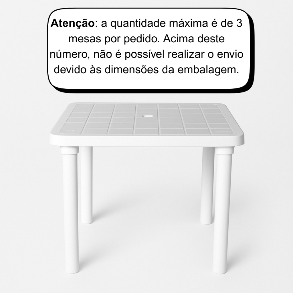 ATENÇÃO !!! PRODUTO LIMITADO A 3 UNIDADES POR COMPRA, PEDIDOS COM MAIS UNIDADES NÃO SERÃO DESPACHADAS. REGRAS DA SHOPEE A Mesa Plástica Quadrada Pé Móvel Cor Branco é um produto de alta qualidade. Esta mesa de cor branca, apresenta um design quadrado, que se adapta perfeitamente a qualquer ambiente, seja ele interno ou externo. Fabricada em polipropileno, um material resistente e durável, esta mesa é feita com material 100% virgem, o que garante uma vida útil mais longa. Além disso, possui proteção contra raios UV, o que a torna ideal para uso ao ar livre, sem medo de desbotamento ou danos causados pelo sol. Um dos principais destaques desta mesa é a sua versatilidade. Ela possui pés removíveis, o que facilita o armazenamento e a torna perfeita para espaços compactos. Apesar de não ser dobrável, a sua estrutura leve, com apenas 4 kg, permite que seja facilmente movida de um lugar para outro. As dimensões da mesa são: 72 cm de altura, 84 cm de largura e 84 cm de profundidade, proporcionando um espaço amplo para acomodar seus objetos. Com a Mesa , você terá um móvel funcional e elegante em sua casa ou jardim.