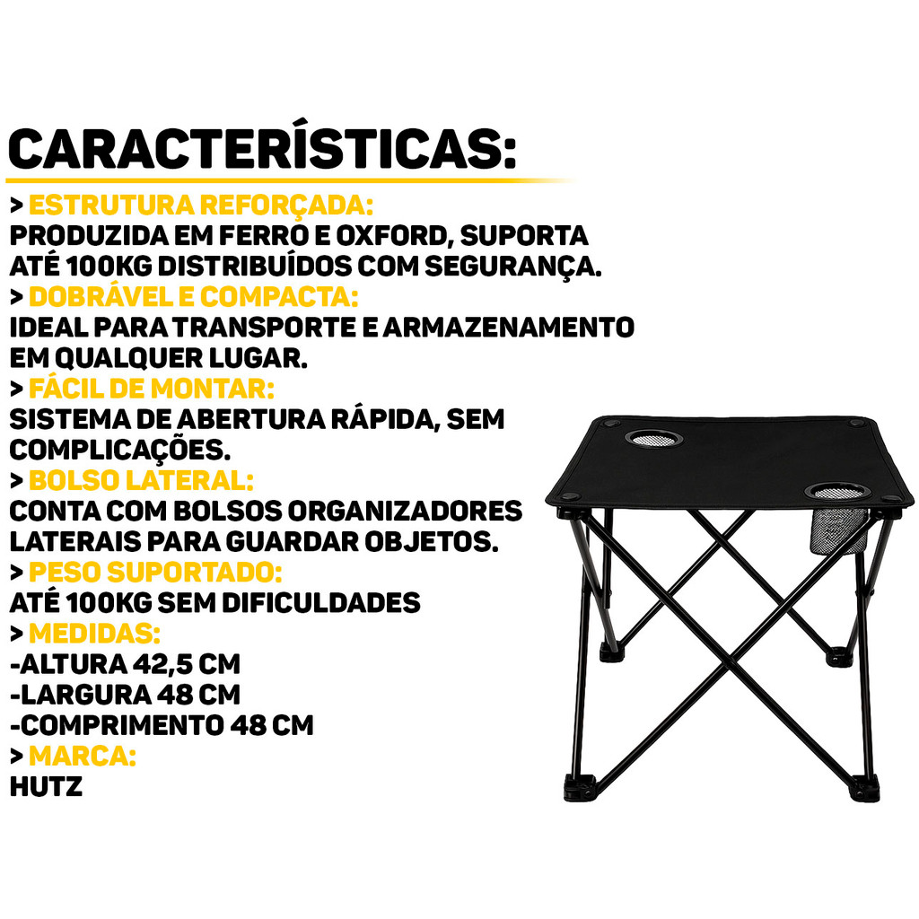 Mesa Dobrável Hutz A Mesa Dobrável Hutz é a solução perfeita para quem busca versatilidade e otimização de espaço sem abrir mão do design. Ideal para ambientes compactos, ela pode ser facilmente montada e desmontada, proporcionando praticidade no dia a dia. Características: > Fácil de montar; > Suporta até 100kg; > Estrutura reforçada; > Produzida em ferro e tecido oxford; > Possui bolsos nas laterais para armazenar objetos. Especificações Técnicas: > Material: ferro e tecido oxford; > Dimensões do produto (C x L x A): 48cm x 48cm x 42,5cm. - Marca: Hutz - Garantia: 90 dias contra defeitos de fabricação Vantagens de comprar na Brester: - Produto a pronta entrega. - Produto novo, com garantia de fábrica. - Nota fiscal para Pessoa Física e Pessoa Jurídica.