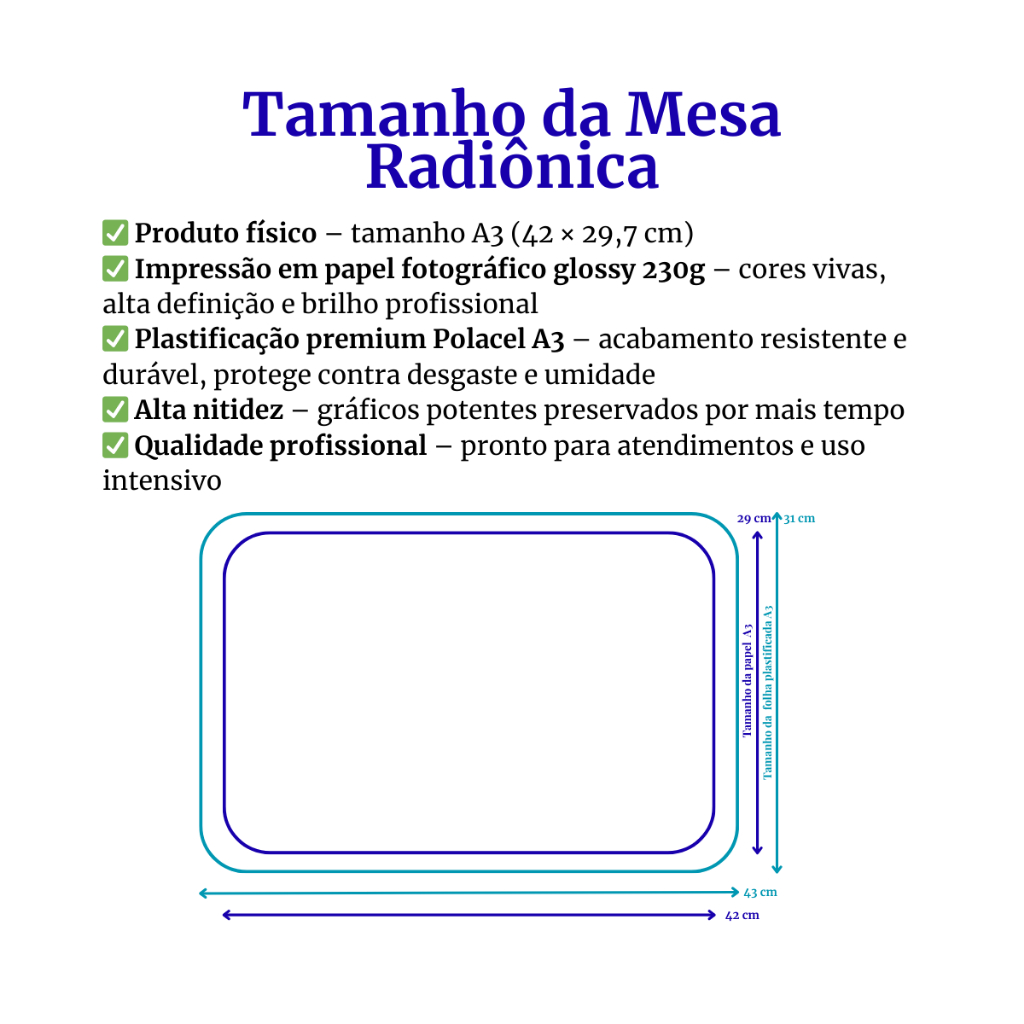 🏡 Mesa Radiônica Aura do Lar – Tema Ambiente (Material Impresso) Material desenvolvido para práticas espirituais, estudos e uso intuitivo, com composição visual voltada a contextos de ambiente e espaço. A estrutura gráfica foi organizada para uso em momentos de reflexão, intenção e práticas pessoais, podendo ser utilizada em diferentes locais. 📌 O que você recebe: • 1 mesa radiônica impressa (tamanho A3) • Material em alta qualidade com plastificação • Manual em PDF com orientações de uso 💡 Indicado para: • Práticas de autoconhecimento • Uso espiritual e intuitivo • Estudos em radiestesia • Uso em ambientes pessoais • Uso individual 🧿 Sobre o material A mesa apresenta elementos gráficos organizados visualmente, podendo ser utilizada como apoio em práticas pessoais e estudos simbólicos. Pode ser utilizada com pêndulo (não incluso), conforme preferência do usuário. 🌿 Contexto simbólico A proposta do material está associada à relação entre pessoa e ambiente, sendo utilizado em práticas que envolvem intenção, organização pessoal e percepção do espaço. 📘 Sobre o manual O manual é enviado em formato digital (PDF), contendo orientações gerais de uso do material. 📏 Especificações • Produto físico impresso • Tamanho A3 • Papel fotográfico • Plastificação para maior durabilidade • Não acompanha pêndulo 📦 Diferenciais • Material resistente e durável • Impressão de alta qualidade • Produto físico (não digital) • Pronta entrega ⚠️ Informações importantes Este produto é um material físico impresso. Não possui componentes eletrônicos. Não emite sinais, frequências ou ondas. Não realiza diagnósticos, previsões ou qualquer tipo de intervenção. Uso voltado exclusivamente para práticas pessoais, espirituais e de autoconhecimento. 🚚 Envio Produto embalado com cuidado para garantir a integridade durante o transporte.