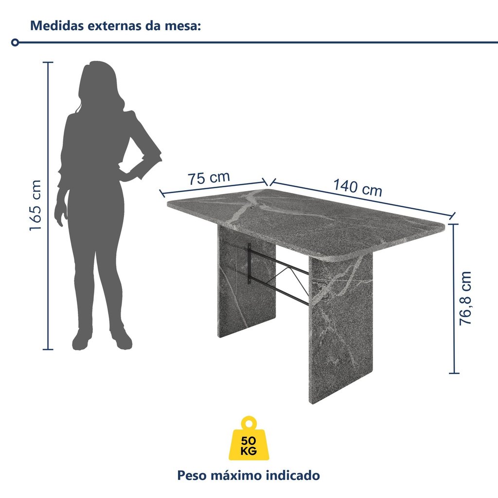 A Mesa de Jantar Topázio com acabamento em granito é a escolha ideal para quem busca resistência e elegância em um só produto. Seu tampo e pés em granito trazem sofisticação e modernidade, enquanto a estrutura reforçada com barra metálica garante estabilidade e durabilidade. Com design imponente, é perfeita para valorizar salas de jantar e áreas gourmet, tornando qualquer ambiente mais acolhedor e estiloso. Essa mesa é pesada? Sim, possui estrutura robusta, o que garante firmeza e estabilidade no uso diário. Como é feita a limpeza do tampo? Basta passar um pano macio levemente úmido com sabão neutro para manter sempre limpa e bonita. Estilo: Moderno Formato: Retangular Peso (kg): 78 Garantia: 03 Meses Altura (cm): 76.8 Acabamento: Sense Extensível: Não Largura (cm): 75 Possui Vidro: Não Possui Rodízio: Não Suporta Até (kg): 15 Profundidade (cm): 140 Escala de Brilho: Semi-Fosco Material do Tampo: Mármore Granito Origem do Produto: Nacional Ambiente Principal: Sala de Jantar Quantidade de Lugares: 6 Marca: Tubulares Paonanda Cor: Granito Topázio Cor do Produto: Preto/Granito Topázio Itens Inclusos: 1 Mesa, Manual de Montagem e Kit ferragem. Cor Predominante: Cinza