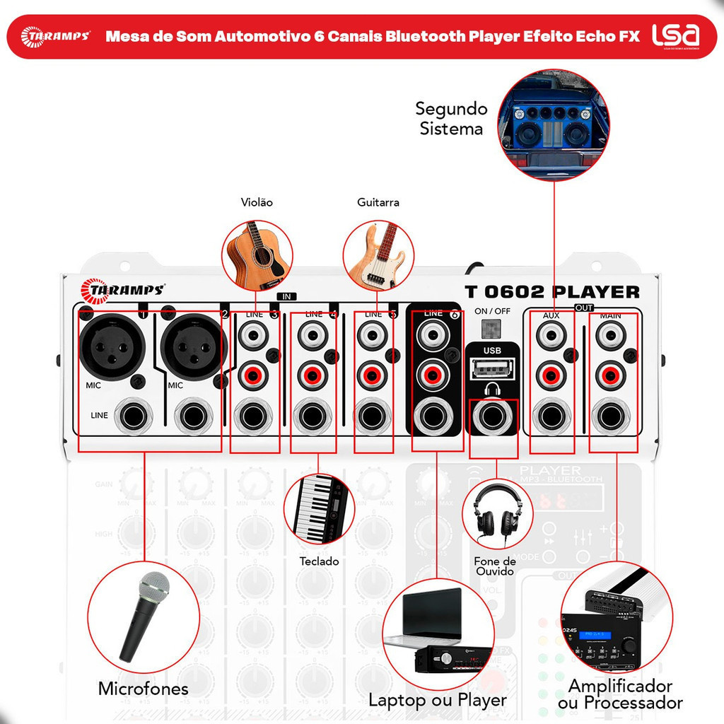 Mesa Taramps T 0602 Player Som Automotivo 6 Canais Bluetooth Usb Fm Equalizador Echo Fx Mixer Audio Automotivo Frete Grátis Pronta Entrega Garantia 12 Meses Controle Remoto Caixas Bob Sistema Profissional Microfone Instrumental Controle seu som com estilo usando a Mesa de Som Taramps T 0602 Player! Com 6 canais e 16 conexões, esta mesa é perfeita para mixar microfones, instrumentos e players em sistemas automotivos, como as famosas "Caixas Bob" ou projetos profissionais. Seu player integrado traz Bluetooth, USB e FM, permitindo que você toque suas músicas favoritas sem precisar de um aparelho extra, tudo com o charme dos LEDs RGB multicoloridos. Por que escolher a T 0602 Player? • Versatilidade: 6 entradas (P10, XLR, RCA) para total flexibilidade. • Efeitos: Echo FX para adicionar eco à voz ou música. • Controle: Equalização de 4 bandas (graves, médios graves, médios agudos, agudos). • Praticidade: Controle remoto para volume, faixas e mais. Especificações Técnicas: • Canais: 6 entradas / 2 saídas • Conexões: 16 (P10, XLR, RCA) • Player Integrado: Bluetooth 4.0, USB (MP3/WMA até 320Kbps), FM (87,5 108MHz) • Resposta de Frequência: 2Hz 76kHz • Sinal/Ruído: > 112dB • Equalização: 4 bandas por canal (±15dB) • Efeitos: Echo FX (50-350ms, 1-12 repetições) Impedância de Entrada: • Mic (XLR): 4K Ohms (desbalanceada) • Line (P10/RCA): 10K Ohms • Impedância de Saída: 47 Ohms • Tensão de Alimentação: 9V 16V DC • Consumo Máximo: 470mA 860mA • Dimensões: 215 x 42 x 236 mm • Peso: 1,18 kg • Código Universal / EAN: 7898556849630 Diferenciais Exclusivos: • Produto 100% original Taramps com garantia de 12 meses. • Brinde especial: Ganhe um relógio funcional (estoque limitado)! • Envio imediato: Postagem em até 24h com rastreio. • T 0602 Player transforma cada ajuste em uma experiência única. Frete grátis (se aplicável) e pronta entrega para você mixar e curtir seu som agora mesmo! Itens Inclusos: • 1 Mesa Taramps T 0602 Player • 1 Relógio funcional (brinde) • 1 Controle remoto IMPORTANTE: A Loja do Som e Acessórios recomenda que a instalação seja feita por profissional especializado e não se responsabiliza pelo mau uso do produto. FAQ: • Como funciona a garantia? R: Nossos produtos têm uma etiqueta de garantia para nosso controle interno, com essa etiqueta identificamos a validade da garantia, portanto NÃO tire a etiqueta do produto. • O produto está disponível a pronta entrega? R: Sim, todos nossos produtos estão em nosso estoque preparado para ser embalado e enviado pra você!