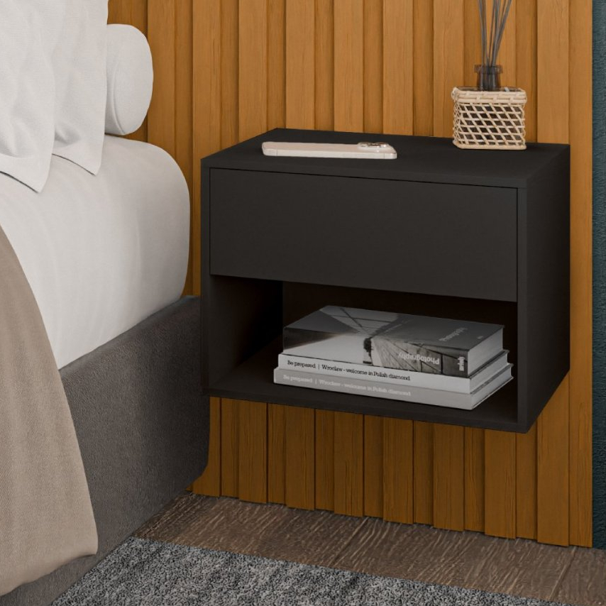 Mesa de Cabeceira Suspensa com Gaveta e Nicho – Design Moderno e Funcionalidade Elegante A Mesa de Cabeceira Suspensa é a escolha ideal para quem busca unir praticidade e estilo em um único móvel. Com um design moderno e minimalista, ela valoriza o ambiente e oferece o espaço ideal para manter seus itens sempre organizados e ao alcance das mãos. Dimensões do Produto Montado Altura: 29 cm Largura: 38 cm Profundidade: 36,2 cm Dimensões da Embalagem Altura: 10,5 cm Largura: 42 cm Profundidade: 37,5 cm Destaques do Produto Design contemporâneo: combina com qualquer estilo de quarto, trazendo leveza e sofisticação à decoração. Estrutura resistente: fabricada em MDP de alta qualidade, garantindo durabilidade e estabilidade. Pintura UV: acabamento elegante, com proteção extra contra riscos e um toque refinado. 1 Gaveta espaçosa: com corrediças metálicas, proporciona um deslize suave e silencioso. 1 Nicho funcional: ideal para armazenar livros, objetos decorativos ou itens de uso diário. Instalação segura: sistema de fixação com cantoneiras metálicas, garantindo firmeza na parede. Capacidade de carga: suporta até 5 kg distribuídos. Observações A loja não oferece serviço de montagem. Acompanha manual de montagem com passo a passo ilustrado. Imagens meramente ilustrativas. Objetos decorativos não acompanham o produto. As tonalidades podem variar de acordo com iluminação ambiente ou configurações de tela/monitor