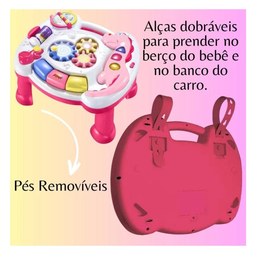 Com a Mesa de Atividades vire a página do livrinho que será reproduzido o som do animal que aparece na imagem, ao mesmo tempo em que luzes coloridas piscam no dragãozinho. Aperte o botão localizado na lateral, que a imagem do cilindro muda para noturna ou diurna e um som correspondente é emitido enquanto luzes coloridas piscam no dragãozinho. O sax reproduz duas diferentes melodias enquanto luzes piscam no ritmo da música. Aperte as teclas para acionar as luzes e ouvir as notas DÓ, RÉ e MI, quando essas são emitidas uma melodia começa. São duas canções diferentes; Gire o mecanismo no meio do brinquedo para ouvir diferentes melodias, continue girando para completar a música enquanto luzes coloridas piscam no dragãozinho. Características gerais: - Possui elementos que vão ajudar os pequenos a desenvolver suas habilidades: motora, auditiva e visual. - Desenvolvida com material de excelente qualidade - Possui pernas removíveis e alças dobráveis para prender no berço do bebê e até 12 opções de diversão. Especificações: Alimentação: 3 pilhas AA inclusas. Marca: Zoop Toys Modelo: Mesa de atividades Código: ZP01041 Material: Plástico Idade recomendada: + 6 Meses Cor: Rosa Certificação Inmetro Garantia: 3 meses contra defeitos de fabricação. Dimensões da embalagem: 26 X 8 X 37 (A X L X C) Peso: 600g