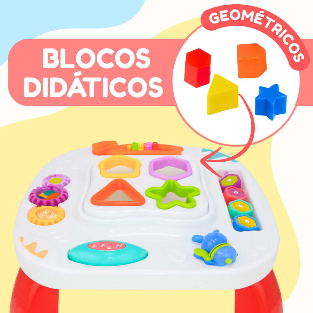 Mesa Educativa Let's Play – Atividades Didáticas para Bebês *As cores dos pés da mesa são sortidas entre vermelho e verde A Mesa Educativa Let's Play foi desenvolvida para estimular as habilidades motoras, cognitivas e sensoriais das crianças de forma divertida e segura. Com cores vibrantes e atividades interativas, ela mantém os pequenos envolvidos enquanto aprendem conceitos importantes como formas, cores, números e coordenação motora. Principais benefícios • Desenvolvimento da coordenação motora fina • Estímulo à percepção visual e tátil • Aprendizagem de formas e cores • Incentivo à lógica e ao raciocínio • Entretenimento seguro e educativo Recursos do produto • Blocos geométricos coloridos para encaixe • Engrenagens giratórias que estimulam causa e efeito • Contador numérico com peças deslizantes • Personagem deslizante que promove interação • Design resistente com pernas firmes e muito estáveis • Cores vivas que atraem a atenção e auxiliam no estímulo sensorial Material e segurança • Produto fabricado em plástico resistente, não tóxico e adequado para crianças pequenas. Bordas arredondadas e peças de tamanho seguro. Indicado para • Crianças a partir de 12 meses. Dimensões aproximadas • Mesa montada: 30 cm x 30 cm x 25 cm