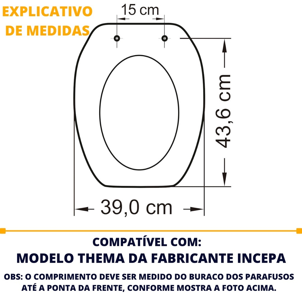 Assento Sanitário Retangular Perfecto Thema Metasul O melhor assento do mercado. Almofadado, macio, resistente, confortável, evita cheiro, fácil instalação. O melhor CUSTO x BENEFÍCIO. Confira abaixo os benefícios: - Produto de qualidade. - Possuem regulagem nos parafusos de fixação para se ajustar ao seu vaso - Tampa com cobertura total do assento com Assento e Tampa lisos que facilitam a limpeza - Formato gota com Local de 'pega' que evitam contato com a bacia sanitária - Respiro para eliminação de ar posicionado adequadamente para evitar contaminação e mau cheiro - Acabamento liso e brilhante deixando o visual do produto mais clean. - Quando fechado reduz o barulho provocado pela descarga. INFORMAÇÕES DO PRODUTO: > Marca: Metasul > Modelo: Perfecto Thema > Modelo: Retangular > Material da base: Soprada em polietileno > Material da tampa: Polietileno injetado (plástico) de alto brilho > Fechamento: Convencional. > Fixadores: Polipropileno (plástico). DIMENSÕES: > 5 x 44 x 39cm Compatível com os Modelos: > Incepa: Thema > Onix: Íris > Agnes-T: Versa > Mondealli: Hawaii > SantaMarina: Valentina MODO DE INSTALAÇÃO: 1. Destaque os parafusos que se encontram junto com o conjunto de fixação. 2. Posicione os parafusos nos orifícios do Vaso Sanitário. Utiliza o encaixe dos parafusos no assento para frente ou para fora, para obter a cobertura ideal no vaso sanitário. 3. Instale uma porca em cada parafuso rosqueando até fixar bem. DÚVIDAS FREQUENTES Os produtos são novos? Sim, todos os nossos produtos são novos. Os produtos possuem nota fiscal tanto para pessoa física quanto para pessoa jurídica? Sim, todos nossos produtos possuem nota fiscal. Os produtos possuem garantia? Sim, todos nossos produtos possuem garantia de fábrica. Posso realizar a troca de endereço após a compra? Não, não é possível alterar o endereço após a finalização da compra, por isso é importante sempre deixar seus dados atualizados. Posso alterar a quantidade ou o produto após a compra? Após a aprovação do pagamento, não é mais possível alterar o produto ou a quantidade. Consigo comprar mais de um item com o mesmo frete? Sim. Nesse caso é só utilizar o carrinho de compras. Obrigado por escolher a Distribuidora Brester.