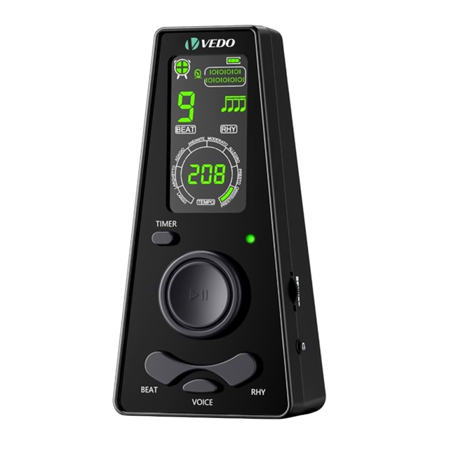 Design moderno e clássico: Um metrônomo digital (andamento 40-208 bpm) no estilo vertical tradicional, construído com uma tela colorida de LCD de fácil leitura; a operação com um toque torna a prática muito mais fácil também;Prática imersiva e interessante: O cronômetro pode ser ajustado para 15 min, 30 min, 45 min e 60 min, dependendo dos seus hábitos ou das diferentes fases de aprendizado; um clique para alternar entre voz e som eletrônico (Observação: quando colocado no modo “Voice”, a contagem vocal é em inglês (ATUALIZADO)).Duas maneiras de ser alimentado: Pode ser alimentado por um cabo USB-C (incluído) ou, para portabilidade, por três pilhas AAA (também incluídas); muito mais compacto e leve do que um metrônomo mecânico padrão de tamanho normal.Volume ajustável: O volume pode ficar muito alto, se necessário, e inclui um conector de saída de fone de ouvido que permite praticar sem incomodar os outros. O metrônomo “lembra” todas as suas configurações, desde que não haja interrupção de energia.Amplas aplicações em todos os instrumentos: Construído com várias batidas e padrões de ritmo, esse metrônomo melhorará seu tempo em uma grande variedade de estilos musicais.