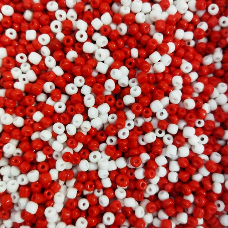 Tamanho 4mm 6/0 Quantidade 1000 unidades Cor VERMELHO E BRANCO ********* MISTURADAS ********* Material vidro Furo passante 1mm Usada na fabricação de Guias de Umbanda, Candomblé, Terços, Pulseiras, Colares e Artesanatos em Geral.