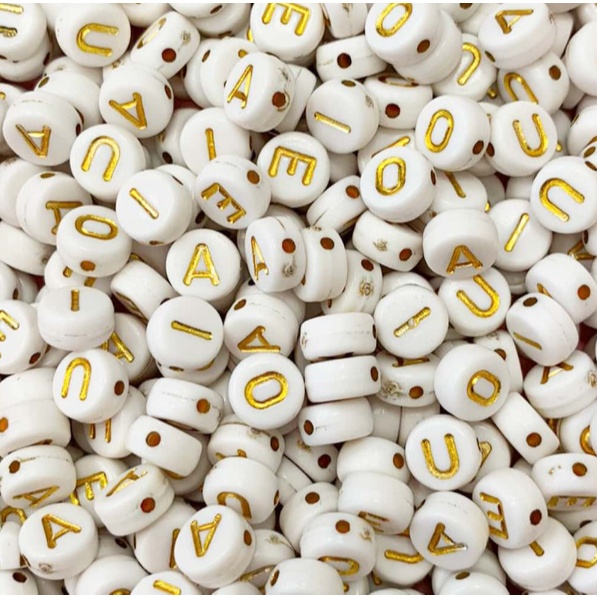 Miçanga Entremeio VOGAIS Redonda Branca Com Letra Dourada 6mm