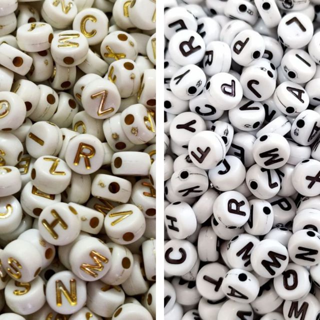 Miçanga Letras Alfabeto 7mm Peças Promoção Letrinhas Redondo Várias CoresDourado e Branco