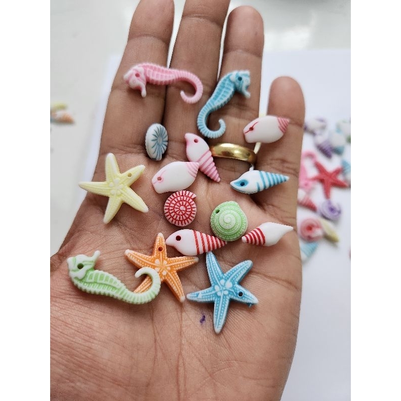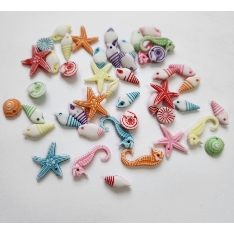 Miçangas marítimas para montagem de Bijuterias. Furo passante. Pacote misto com estrela, cavalo marinho, conchas e caracol. Tamanhos aproximadamente 1,5cm Pacote com 50 Peças.