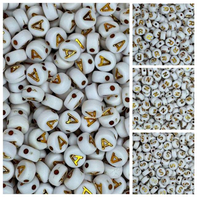 Miçangas Redonda Alfabeto Branco com Dourado 7mm - Letras Separadas
