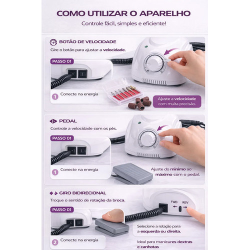 MICRO MOTOR PROFISSIONAL 50.000 RPM ALTA POTÊNCIA Equipamento de alta performance, ideal para uso profissional e multiuso, oferecendo potência, precisão e durabilidade para diversas aplicações. O micro motor 50.000 RPM é amplamente utilizado por profissionais que buscam eficiência e acabamento perfeito. Antes de realizar a compra, verifique a voltagem disponível na sua região (110V ou 220V) e selecione a opção correta. DESCRIÇÃO DO PRODUTO O micro motor profissional para manicure, odontologia e trabalhos técnicos foi desenvolvido para proporcionar praticidade, eficiência e baixa manutenção no dia a dia. Com excelente custo-benefício, é ideal para quem procura um micromotor potente e versátil. Muito utilizado como motor para unha, motor de bancada, motor para prótese dentária e também em trabalhos artesanais, garantindo alto desempenho e precisão. INDICAÇÃO DE USO Ideal para: Laboratório de prótese dentária Odontologia e desgaste de materiais Manicure e pedicure profissional Podologia e estética Joalheria e chaveiros Trabalhos em madeira e metal Uso como micromotor para unha gel e acrigel PRINCIPAIS BENEFÍCIOS Alta rotação de até 50.000 RPM Micro motor potente e eficiente Ideal para manicure profissional e uso técnico Baixa manutenção e alta durabilidade Controle preciso de velocidade Sistema de proteção contra sobrecarga ESPECIFICAÇÕES TÉCNICAS Velocidade: até 50.000 RPM Potência: 65W Torque máximo: 300 gf-cm / 2,94N Controle manual de velocidade Rotação reversa (direita/esquerda) Sistema overload de proteção Pedal liga/desliga Compatível com brocas e acessórios diversos CARACTERÍSTICAS Caneta com 4 rolamentos blindados Sistema antipoeira Suporte de bancada para caneta Adaptador para contra-ângulo (opcional) Equipamento resistente e durável CONTEÚDO DA EMBALAGEM 1x Micro motor profissional 1x Caneta 1x Pedal liga/desliga 1x Suporte para caneta GARANTIA Garantia do vendedor: 3 meses