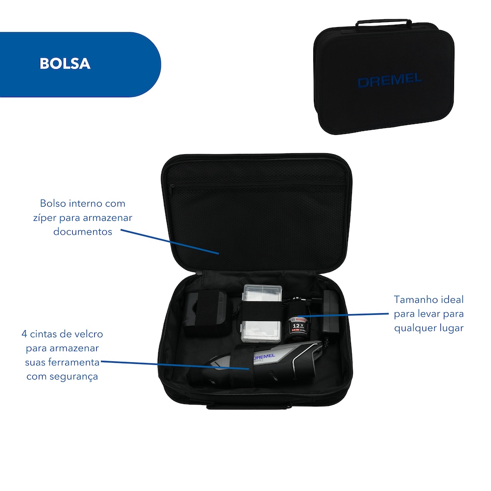 Dremel 8240 12V com 2 Baterias e Carregador Bosch + Bolsa Descrição: - Micro Retífica de alto rendimento 8240; - A Dremel 8240, perfeita para trabalhos exigentes como cortar, perfurar, lixar e fresar, oferece a comodidade do funcionamento sem fio sem alterar o desempenho; - Projetada pensando em você, o corpo macio de borracha proporciona fácil manuseio e controle superior, enquanto os indicadores LED mostram a duração restante da bateria; - Velocidade variável de 5.000 a 35.000 RPM para máximo controle e precisão; - Totalmente compatível com todos os acessórios e acoplamentos das Micro Retíficas Dremel; - Garantia 24 meses Dremel. Vantagens: - Seletor de velocidade variável, com 5 níveis; - Indicadores de duração da bateria; - Não esquenta em serviços pesados e de longa duração; - Baixo nível de ruído e vibração; - Troca de acessórios rápido com EZ Twist; - Materiais que se pode trabalhar: Madeira, Metal, Plástico, Couro, EVA, Papelão, Cerâmica, Pedra, Vidro, Fibra de vidro. Dados Técnicos: - Marca: Dremel; - Modelo: 8240; - Potência: 175W; - Com velocidade variável; - Número de velocidades: 5; - Numero de rotações: 5.000 até 35.000 rpm; - Sem controle de torque. Carregador bateria GAL 12V-20 e 2 Baterias 12V 2,0Ah Vantagens: - O Conjunto de 2 Baterias com Carregador Bivolt GAL 12V-20 da Bosch é perfeito para quem quer trabalhar sem interrupções no dia a dia; - Sistema profissional de 12V, permitindo que as baterias possam ser utilizadas em todas as ferramentas de 12V da Bosch; - As baterias contam com tecnologia de Íons de Lítio, sem efeito memória ou auto descarga; - Indicado para uso industrial contando com 2 anos de garantia Bosch. Dados Técnicos: - Capacidade da bateria: 2 Ah; - Voltagem da bateria: 12 V; - Composição da célula da bateria: Íons de Lítio; - Número de Células de íons de lítio: 3; - Conteúdo da bateria de íons de lítio: 24; - Tempo de carga: 65 min; - Fonte de energia bivolt; - Peso (bateria): 175 g; - Peso (carregador): 250 g. Bolsa de Lona Dremel Descrição: - Mantenha suas ferramentas e acessórios Dremel sempre organizados e protegidos com esta bolsa de nylon resistente e prática! - Com um zíper reforçado, ela garante segurança no transporte e armazenamento. Além disso, suas 4 cintas de velcro permitem prender firmemente suas ferramentas, oferecendo ainda mais estabilidade e proteção, seja para guardar em casa ou em deslocamento; - Ideal para quem busca praticidade, organização e segurança em um só produto! - Garantia de 6 meses Dremel. Dados Técnicos: - Marca: Dremel; - Composição: Nylon; - Quantidade de bolsos: 2; - Quantidade de cintas velcro: 4. Itens Inclusos: - 01 Micro Retífica Dremel 8240 12V; - 02 Baterias GBA 12V 2,0 Ah; - 01 carregador bivolt GAL12V-20; - 01 Bolsa de Nylon Dremel.