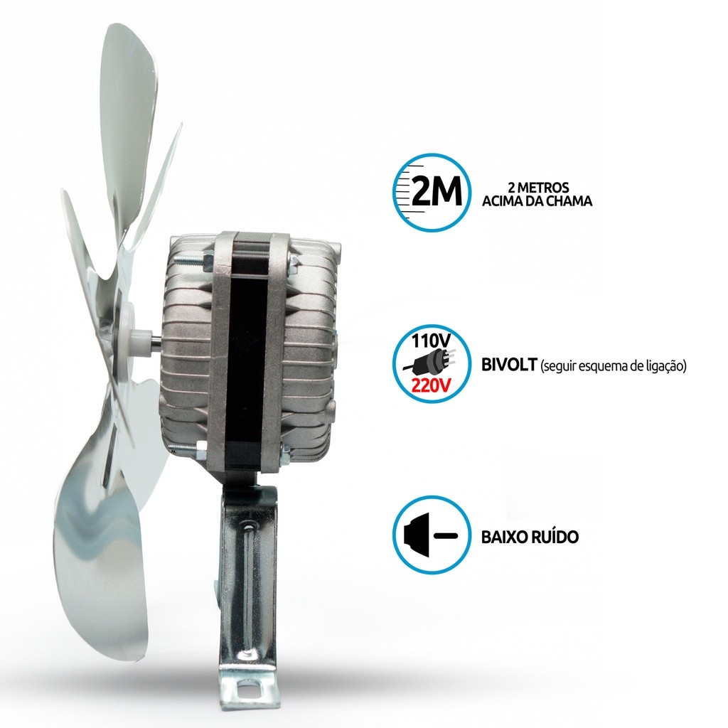 Micro Motor Exaustor 1/40 com hélice de alumínio 20cm Tensão 127V/220V Características Técnicas: Hélice: 200mm Vazão: m³/h: 300 CFM: 196 IT/Seg.: 92 - AMP: 0.80 / 0.32 Velocidade RPM: 1300 Potência: HP: 1/40 Motores: Lubrificação Permanente Temperatura De Trabalho: - 30°C à + 80°C Isolação: Classe B Proteção Térmica: 135°C Grau De Proteção: IP42 BIVOLT Vai com esquema de ligação. Hélice ALUMÍNIO 20CM Comprimento dos fios de instalação: 50cm Pode ser usado como ventilador, ventilador para churrasco Baixo ruído. Não precisa de capacitor para instalar. Em caso de uso com dimmer recomendamos acima de 500 watts -O duto da chaminé deve ter no mínimo 5cm maior que o tamanho da Hélice. -Altura mínima de 2 metros de distancia da chama. -Recomendado usar manta para alta temperatura na fiação. Ideal para qualquer tipo de churrasqueiras e lareiras, de casas ou apartamentos - Agora você pode curtir seu churrasco sem problemas, deixando seu assado muito mais saboroso - Suporte em aço - Protetor térmico no motor - hélice de alumínio - Facilidade na instalação A fumaça agora com o destino certo! VOCE RECEBE JUNTO MANUAL DE ESQUEMA DE LIGAÇÃO 110V E 220V CASO LIGUE A PEÇA ERRADO ELA FUNCIONARÁ POR ALGUNS MINUTOS E DEPOIS VAI PARAR (QUEIMAR) NESSE CASO NÃO COBRIMOS GARANTIA, POIS, TRATA-SE DE DEFEITO OCASIONADO