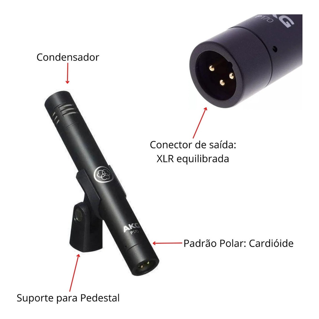 A AKG se estabeleceu como uma das mais importantes empresas de microfone graças à versatilidade, dinâmica e qualidade de seus produtos. Aposta por um design industrial de ponta, eletrônica inovadora e acústica de classe mundial. Com uma seleção impressionante para escolher, com a AKG você vai encontrar o microfone perfeito. Com este produto, você conseguirá que a reprodução obtida seja o mais semelhante ao original. Excelente para gravar vozes devido à sua sensibilidade e a ampla faixa de frequência. Sendo condensador, vai permitir um resultado claro e fino. É ideal para percussões, guitarras, pianos, entre outros. Pela sua resposta tão definida à voz, é o mais escolhido pelos profissionais. Seu padrão polar cardióide oferece uma maior sensibilidade aos sons frontais, o que evita o ruído proveniente da parte posterior. O P170 é um microfone condensador de diafragma pequeno para gravação de overheads, percussão, violões e outras cordas. Seu diafragma transdutor de condensador verdadeiro de 1/2 polegada leve oferece excelente clareza e resposta transitória. O P170 utiliza a experiência de engenheiros de som de todo o mundo e é considerado uma alternativa acessível ao lendário AKG C451 B. Corpo resistente todo em metal e design robusto, resiste ao exigente uso diário. Garanta o seu!!! Especificações Técnicas: • Largura de Banda da Frequência de Áudio: 20 - 20000 Hz • Nível de Ruído Equivalente: 19 dB-A • Sensibilidade: 15 mV/Pa • Relação Sinal/Ruído: 75 dB-A • Pad de Pré-Atenuação: -20 dB • Impedância Elétrica: <= 200 Ohms • Carga de Impedância Recomendada: >=1000 Ohms • Padrão Polar: Cardioide • Tensão: 44 a 52 V • Corrente: <= 3 mA • Saída de Áudio: Balanceado XLR • Gênero: Macho • Conectores: 3 Pinos Conteúdo da Embalagem: • 01 Microfone de Instrumento de Alto Desempenho - AKG P170 • 01 Suporte Para Pedestal • Manual e Certificado de Garantia Importante: • Garantia de 273 Dias.