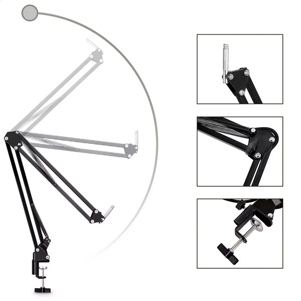 Microfone Condensador Profissional Kit Completo Braço Articulado Pop Filter Estúdio Podcast Metal