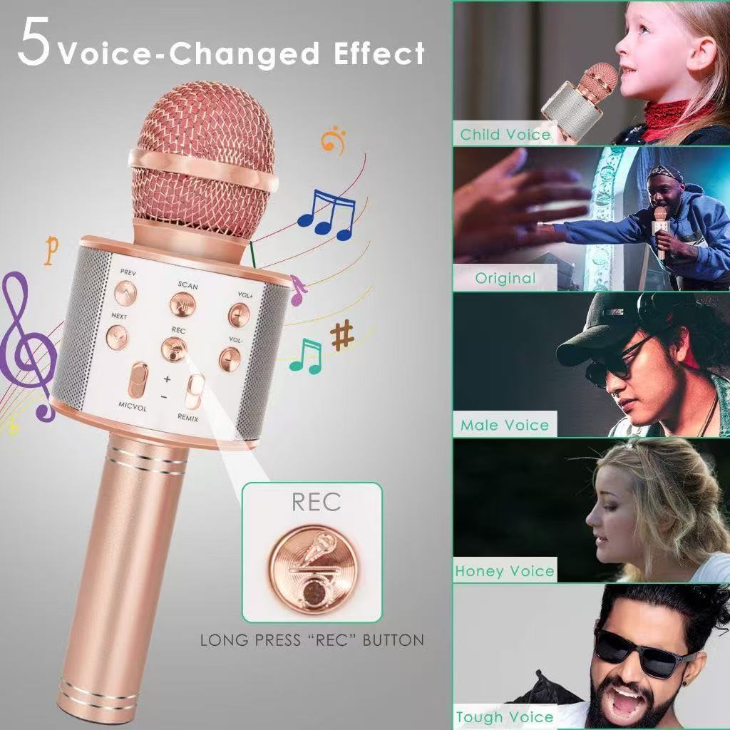 Microfone Bluetooth Karaokê WS-858 O microfone é relativamente pequeno e não ocupa muito espaço em sua bolsa. É muito portátil .A aparência adota o princípio da mecânica do corpo humano, seu punho é projetado razoavelmente, e sua aderência é mais confortável. A mão não terá sensação de dor quando usado por um longo tempo. Pode fazer conexões sem fio de bluetooth sobre longas distâncias. É muito prático e conveniente. Tem uma vasta gama de aplicações. É adequado para cantar, jogar, festas e entretenimento familiar. Basta conectar ao Bluetooth do telefone móvel para sincronizar com suas músicas prediletas: o som do celular passa a sair no microfone junto a sua voz. =>Função Auto-Tune ajustável + 4 tipos diferentes de vozes. =>Função de cancelamento de ruído. Microfone capacitivo sem fio, você pode desfrutar e cantar suas músicas com praticidade pelo próprio microfone. Especificações: • Modelo: WS -858 • Tamanho do Item: aprox.221 * 76 * 76mm • Potência de saída: 10mW (saída de fone de ouvido) • Tipo de alimentação de Carregamento: DC5V • Faixa de Freqüência: 100Hz-10KHz • Capacidade da Bateria: 1800mAh • Máximo nível de pressão sonora: > 115dB 1 kHz THD
