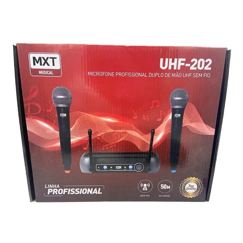 Seja bem vindo a loja Sonn! MICROFONE DUPLO DE MÃO SEM FIO Especificações: Modelo: UHF-202 duplo Marca: MXT Alcance até 100 metros Frequência fixa 686.1 & 690.3MHz / 687.6 & 695.5MHz **Objetivo principal oferecer liberdade e áudio claro para dois usuários simultâneos, sem a complicação dos cabos. **Seu diferencial é a conexão UHF estável, que minimiza interferências e garante performances confiáveis em qualquer evento. Agradecemos sua visita, esperamos sua compra!