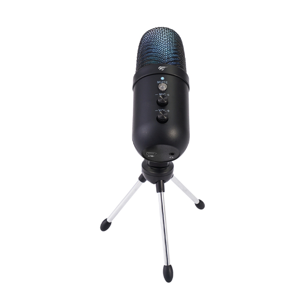 Microfone gamer da marca Havit, modelo GK51, uma das marcas mais conceituadas em game O microfone como com iluminação em led que muda aletoriamente na cor RGB. O led não pode ser desligado. Para mutar o microfone basta apertar o botão nele que o led ficara automaticamente na cor vermelha. indicando que esta no modo mute, para desmutar basta apertar o botão novamente e a cor do led ficara na cor azul A montagem do produto é feita sobre a mesa, o microfone tem um tripe para fixação do microfone ou pode ser usado com um braço articulado se você tiver Ele ainda tem a opção de conectar o seu headset direto no microfone com uma entrada única P3 de 3.5mm que é a mais comum em qualquer fone de ouvido. A conexão do produto no computador é exclusivamente via USB, que pode ser na placa mãe ou no gabinete do seu computador
