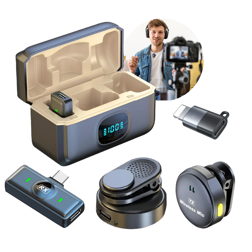 🎤 Microfone Sem Fio Duplo 2.4G com Case – Qualidade Premium para Suas Gravações Eleve o nível do seu conteúdo com um microfone projetado para entregar som limpo, estável e profissional. Perfeito para criadores exigentes, entrevistas, gravações externas e vídeos que precisam transmitir credibilidade. ✨ Destaques Premium ⭐ Dois microfones para vídeos perfeitos ⭐ Case carregador com display digital ⭐ Compatível com Android e iPhone 🎬 Feito para quem exige mais Criadores de conteúdo Vendedores online Professores Entrevistas e podcasts Lives e videoclipes Vídeos profissionais e institucionais ✔ Especificações Técnicas Distância: até 20m Case com display digital Conexão: 2.4G Bateria de longa duração com recarga no estojo ✔ Conteúdo da Caixa 2x Microfones sem fio 1x Receptor 1x Adaptador Tipo-C 1x Adaptador Lightning 1x Case carregador com visor 1x Cabo