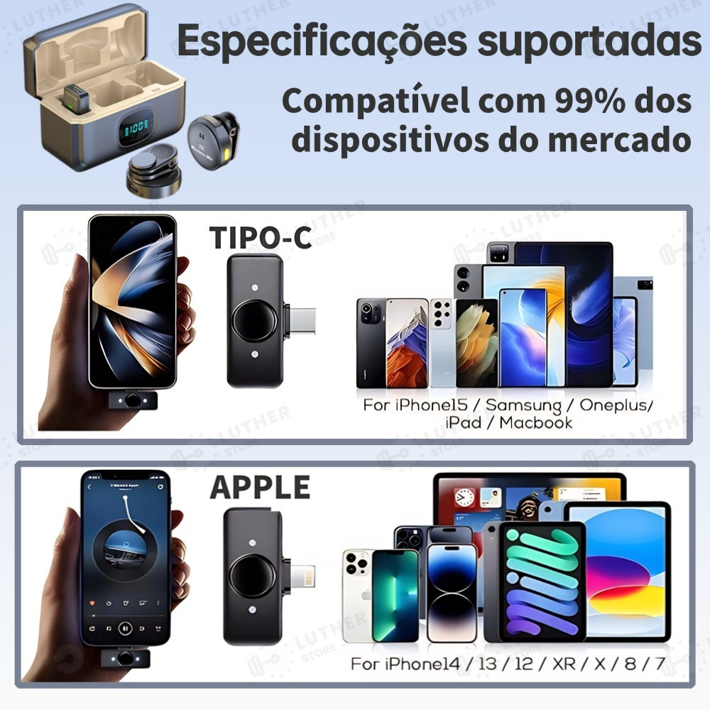 Este microfone de lapela sem fio vem com um receptor Tipo C e um adaptador Lightning e é compatível com a maioria dos telefones Android e iOS do mercado. Transforme suas gravações e especiais com o Microfone Lapela Duplo Sem Fio Ideal para criadores de conteúdo, jornalistas, profissionais de comunicação e quem busca praticidade e qualidade no áudio, esse microfone é perfeito para qualquer situação. 1 - Áudio Profissional de Alta Qualidade – Com captação clara e sem interferências, seu som será nítido e sem ruídos indesejados. 2 - Compatibilidade – Conecte-se facilmente ao seu dispositivo com Lightning, Tipo-C. Versatilidade para usar com celulares, câmeras e computadores! 3 - Sem Fio e Prático – Movimente-se com liberdade durante gravações, entrevistas ou apresentações, sem se preocupar com cabos. 4 - Duplo Microfone – Perfeito para gravação em dupla, entrevistas ou podcasts, capturando o som de ambas as fontes de forma equilibrada. 5 - Plug and Play – Instalação rápida e simples. Conectei, gravou! Sem necessidade de ajustes complicados ou softwares adicionais. Chip DSP de Cancelamento de Ruído filtra ruídos indesejados, garantindo som cristalino. Captação omnidirecional para gravação em ambientes internos e externos. Compatibilidade Versátil Funciona com smartphones (Android e iOS), tablets, computadores, câmeras e até sistemas de som. Plug & Play: conecte o receptor e comece a gravar ou transmitir imediatamente. Design Prático e Portátil Caixa de carregamento Type-C com longa duração de bateria para maior conveniência. Compacto e leve, perfeito para gravação ao ar livre. Recurso de Monitoramento em Tempo Real Permite ajustar o áudio durante a gravação, oferecendo resultados profissionais. Com este microfone sem fio, você terá a solução perfeita para gravações, apresentações e interferências ao vivo. Fácil de usar, portátil e altamente eficiente!