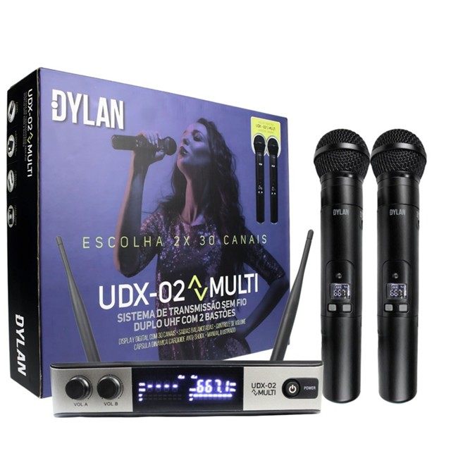 O Microfone Sem Fio Duplo Dylan UDX-02 Multi Dinâmico Cardioide é a solução perfeita para quem busca qualidade sonora superior e liberdade de movimento. Com tecnologia UHF, este microfone oferece uma faixa de frequência de 663,5 a 693,5 MHz, garantindo uma transmissão segura e sem interferências. Ideal para eventos, apresentações ao vivo, palestras, igrejas e estúdios, ele proporciona um som cristalino e estável. A Dylan é uma marca reconhecida por sua inovação e qualidade, e o UDX-02 MULTI não é exceção. Equipado com cápsula anti-shock, este microfone reduz ruídos indesejados, oferecendo um áudio limpo e profissional. O display digital nos bastões exibe informações essenciais como canal, tempo de bateria e intensidade do sinal RF, permitindo controle total sobre a performance. A troca de canal é feita com apenas um toque, evitando interferências em ambientes com múltiplos sistemas sem fio. Com um alcance de até 50 metros e alimentação por pilhas alcalinas AA que garantem até 10 horas de uso contínuo, o UDX-02 MULTI é altamente confiável para qualquer ocasião. O kit inclui dois microfones bastão com chave on/off e botão de troca de canal, um receptor de um canal, um cabo P10/P10, uma fonte bivolt, um case para transporte e um manual ilustrado para facilitar a instalação e o uso imediato. **ESPECIFICAÇÕES TÉCNICAS:** - Marca: Dylan - Modelo: UDX-02 - Faixa de frequência: 663,5 – 693,5 MHz - Resposta de frequência de áudio: 50 Hz a 15 kHz - Potência de RF: 30 mW - Bastões com chave on/off e botão para troca de canal - Display digital com indicação do canal, tempo de bateria e sinal de RF - Cápsula anti-shock - Alimentação: Pilhas alcalinas AA (10 horas de duração) - Distância da base: até 50 metros dentro das condições ideais - Conector: XLR macho 3 pino ¼”(P-10) - Fonte de Alimentação: Adaptador 100V ou 220V **ITENS INCLUSOS:** - 1x Case para transporte - 2x Microfones bastão UDX-02 MULTI - 1x Receptor UDX-02 MULTI de um canal - 1x Cabo P10/P10 - 1x Fonte bivolt - 1x Manual ilustrado **INSTRUÇÕES DE USO:** 1. Insira as pilhas AA nos microfones e no receptor. 2. Conecte o receptor à fonte de energia e ao sistema de som usando o cabo P10. 3. Ligue os microfones e o receptor, e ajuste o canal desejado. 4. Verifique o display digital para garantir que o canal e o sinal RF estão corretos. 5. Realize um teste de som para ajustar o volume e a equalização conforme necessário. **ORIGEM DO PRODUTO:** - Fabricado por DYLAN **GARANTIA:** Produto 100% original, com garantia de 90 dias em todo o Brasil. Com alta definição de áudio, praticidade e tecnologia avançada, o UDX-02 MULTI entrega qualidade profissional para quem não pode correr riscos. Não perca tempo, adquira já o seu e garanta uma experiência sonora impecável!