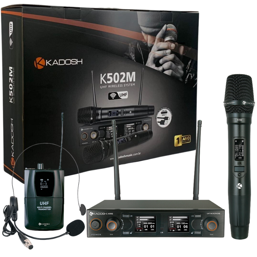 Microfone sem fio duplo compacto destinado ao uso em igrejas, auditórios, palestras, shows e muito mais. Desenvolvido especialmente para uso em vocal, ao vivo, multimídia, gravação e podendo ser usado para captação de instrumentos de sopro e amplificadores de guitarra. Recomendado para padres, pastores, cantores, apresentadores e muito mais. Especificações: Marca: Kadosh Modelo: K502 Range de Frequência: 660.000 MHz – 689.700 MHz Modulação: FM / UHF Padrão Polar: Cardioide Sistema PLL Antena dupla omnidirecional LCD colorido com informações, incluindo gráfico de espectro RF Resposta de Frequência: 80Hz – 18.000Hz ± 2dB Duplo Microfone de Mão (Bastão) Bateria de Lítio 3.7V recarregável na própria base através de cabo mini USB (para modelo com Handheld) Transmissor headset = Funciona somente com pilhas AA Garantia: 1 ano Itens Inclusos: K502M – Duplo Mão 2 Bastões 1 Receptor 1 Cabo de carregamento duplo 2 Baterias 1 Cabo P10 P10 1 Fonte de alimentação K502C – Headset + Mão 1 Bastão 1 Bateria 1 Bodypack 1 Headset 1 Lapela 1 Receptor 1 Cabo de carregamento 1 Fonte de alimentação 1 Cabo P10 P10 1 Cabo P10 Mini XLR 2 Pilhas K502H – Duplo Headset 2 Bodypacks 1 Receptor 2 Headsets 2 Lapelas 1 Fonte de alimentação 1 Cabo P10 P10 2 Cabos P10 Mini XLR 4 Pilhas Produto original, somos revendedor autorizado. Perguntas Frequentes Emite Nota Fiscal? Sim. Caso precise de Nota Fiscal para CNPJ, efetue a compra com o CNPJ desejado. Não podemos alterar os dados da Nota Fiscal após a compra. Quem somos? A Top Music Instrumentos Musicais está há mais de 20 anos no mercado. Temos a missão de garantir a satisfação total de nossos clientes, tanto nos produtos vendidos quanto no atendimento prestado. Pronta entrega? Todos os nossos produtos estão disponíveis. É original, tem garantia? Sim. Todos os nossos produtos são originais, novos, com garantia e Nota Fiscal. Qualquer problema de fabricação, basta entrar em contato pelo campo de mensagens. Posso retirar o produto? Não. Produtos Como realizo o pagamento? O pagamento pode ser feito através dos meios que a Shopee oferece. É rápido, seguro e sem custo adicional, aceitando as principais bandeiras de cartão.