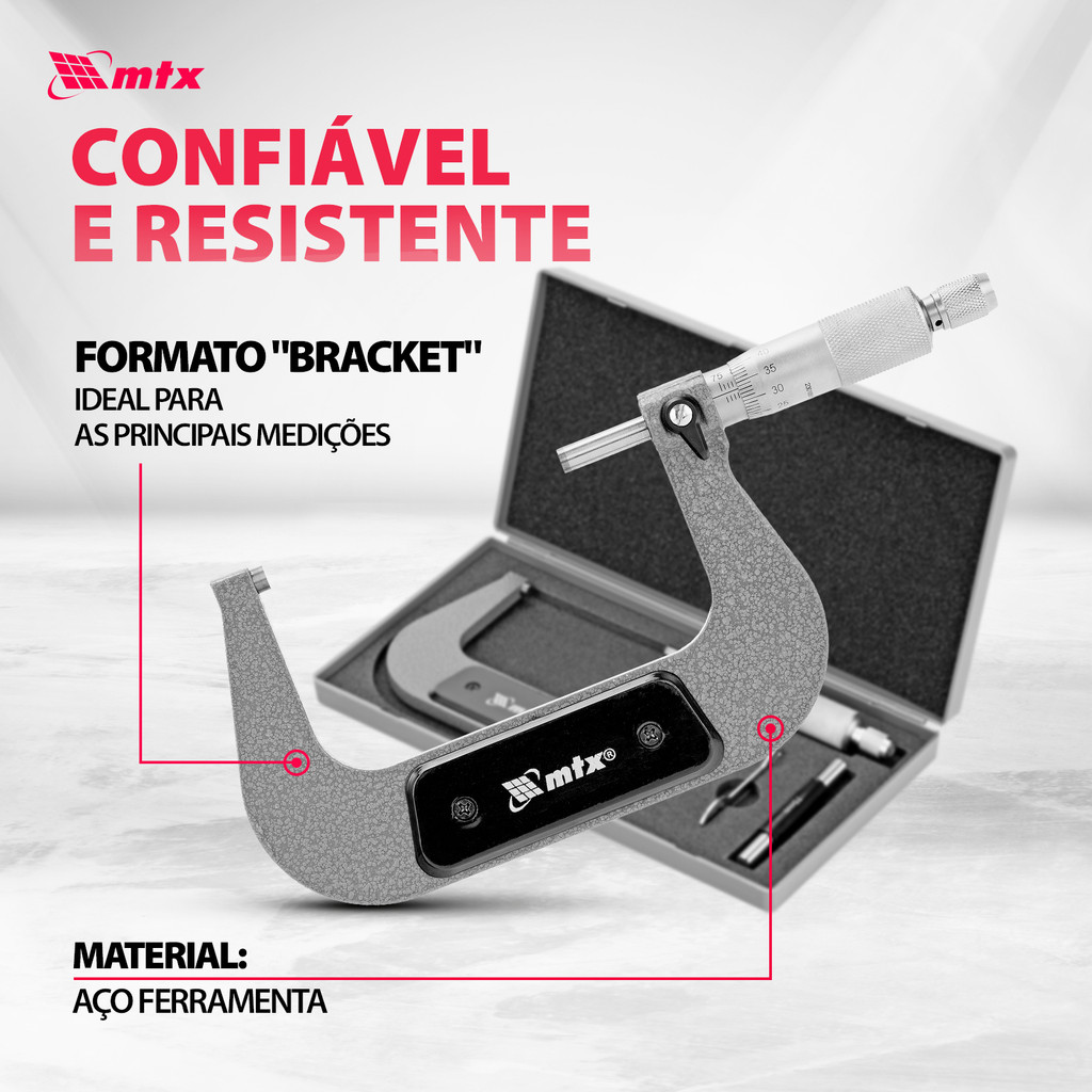 Micrômetro Mecânico MTX 3170059: Precisão Insuperável em Medição de Espessura Introduzindo o Micrômetro Mecânico MTX 3170059, uma ferramenta essencial projetada para medir com precisão a espessura de chapas de metal e peças no intervalo de 75-100 mm. Este dispositivo é a personificação da precisão, oferecendo leituras com uma etapa de medição de 0,01 mm e uma tolerância permitida de apenas ± 0,004 mm. Acompanhado de uma medida de ajuste para calibração conforme necessário, o micrômetro MTX 3170059 é uma adição valiosa para qualquer produção, oficina mecânica ou serviço automotivo, onde a precisão é primordial. Principais Vantagens: Resistência e Durabilidade Excepcionais: Fabricado em aço ferramenta de alta qualidade, o micrômetro MTX 3170059 é construído para resistir ao teste do tempo. Sua robustez assegura que a ferramenta permaneça precisa e confiável, mesmo sob uso intenso em ambientes industriais. Leitura Conveniente dos Resultados: A engenhosa construção deste micrômetro inclui um batente que fixa o parafuso micrométrico, facilitando a leitura dos resultados sem erros. Essa característica é especialmente útil em ambientes de trabalho rápidos, onde cada segundo conta. Proteção Durante Armazenamento e Transporte: Compreendendo a importância da integridade do instrumento, o micrômetro é fornecido em uma caixa de plástico resistente, complementada com um forro de espuma. Esta embalagem garante que o dispositivo seja armazenado e transportado sem risco de danos, mantendo sua precisão para uso imediato sempre que necessário. Por Que Escolher o Micrômetro Mecânico MTX 3170059? A escolha do Micrômetro Mecânico MTX 3170059 para suas necessidades de medição de precisão oferece não apenas uma ferramenta de medição excepcionalmente precisa, mas também um investimento em durabilidade e confiabilidade. Seja para aplicações na produção industrial, manutenção mecânica, ou serviços automotivos, este micrômetro garante resultados de medição exatos, contribuindo significativamente para a qualidade e eficiência do trabalho. Transforme a Precisão da Medição em Seu Padrão Operacional com o Micrômetro Mecânico MTX 3170059. Esta ferramenta não apenas atende às suas expectativas de precisão e confiabilidade, mas as supera, tornando-se um componente indispensável do seu conjunto de ferramentas de medição.