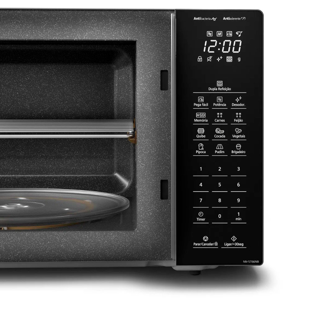 Microondas ST66N 34 Litros Panasonic Características: Modelo: NN-ST66NBRUK Potência: 900W Peso do Produto: 14,8 kg Capacidade: 34 Litros Consumo de Energia: A Função Dupla Refeição Desodorizador Função Pega Fácil Tecnologia Antibacteria AG Antiaderente 6 Funções Programadas Conteúdo da Embalagem: Prato e Manual Garantia do Fornecedor: 12 Meses