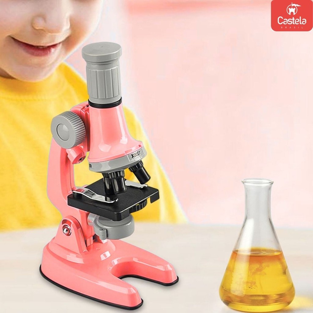 Microscópio Rosa Infantil Didático Educacional 100x 400x 1200x Kit c/ Lâminas e Acessórios – Castela
