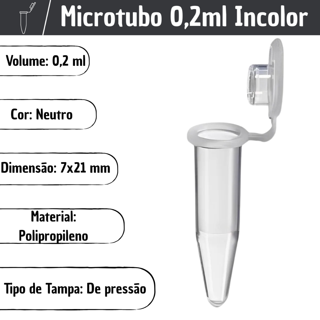 Microtubo 0,2ml - Pacote C/ 1000 Unidades Microtubo de centrifugação para armazenagem de amostras líquidas e sólidas; Capacidade 0,2ml (200 microlitros) e resistente a congelamento; Tampa plana de pressão com vedação total contra vazamentos; Cor: Incolor, Rosa, Azul, Verde, Preto, Âmbar, Amarelo Tipo de embalagem: Pacotes com 1.000 unidades