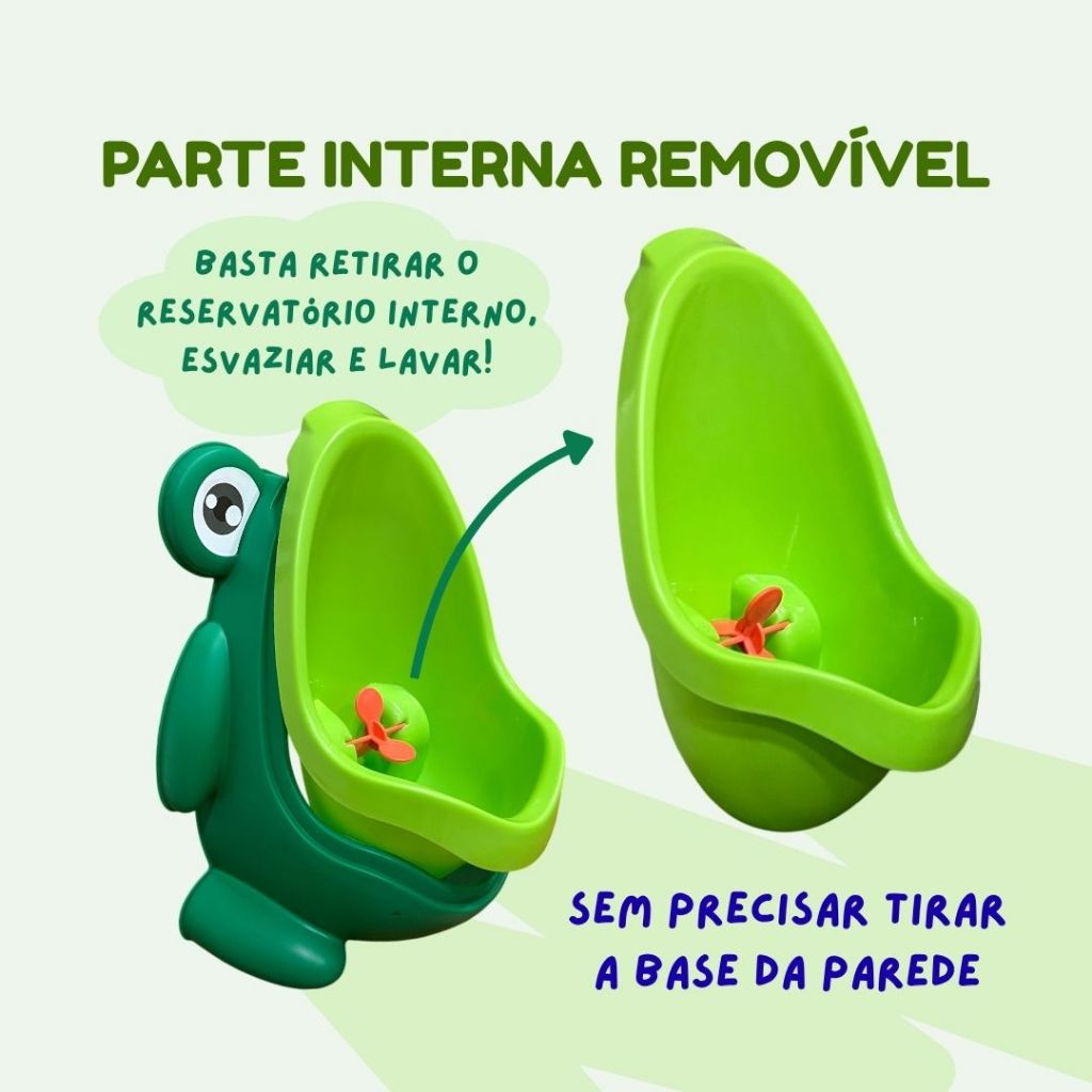 🐸Mictório Infantil Sapinho com Alvo Giratório | Fixação com Ventosa ou Gancho | Fácil Limpeza🐸 Desfralde com leveza e diversão! O Mictório Infantil Sapinho transforma o xixi em uma brincadeira educativa. Com formato lúdico, hélice giratória como alvo e instalação prática, ele ajuda os meninos a se acostumarem com o uso do banheiro de forma independente e sem estresse. 🔹 BENEFÍCIOS: 🐸 Design lúdico: formato de sapinho que encanta e engaja a criança. 🎯 Alvo giratório interativo: hélice que gira ao ser atingida, estimulando a coordenação e tornando o uso mais divertido. 💦 Limpeza prática: parte interna removível para esvaziar e lavar sem esforço. 🛠️ Instalação rápida: fixação com ventosas inclusas ou orifício para uso com gancho (gancho de parede não incluso). 👶 Apoia o desfralde: incentiva a autonomia e reduz o uso de fraldas. 🌱 Seguro e higiênico: material atóxico, sem cheiro e fácil de limpar. 🏡 RECOMENDAÇÕES: • Utilize sempre com supervisão de um adulto. • Fixe em altura confortável para a criança. • Esvazie o reservatório após cada uso para manter a higiene. • Para maior fixação, limpe bem a superfície antes de aplicar as ventosas. ⚙️ ESPECIFICAÇÕES TÉCNICAS: Material: Plástico atóxico Cor: Verde Tamanho (L x C x A): Aproximadamente 22cm X 29cm X 15cm 📦 CONTEÚDO DA CAIXA: • 1 Mictório Infantil Sapinho com Alvo Giratório. Atenção: A cor do produto pode variar de acordo com as configurações do seu aparelho, contraste e iluminação do ambiente. ⭐ Produto de Alta Qualidade 🎁 Ótima opção para presentear você e o seu bebe! 📌 Garanta já o seu! Clique em COMPRAR agora e aproveite! 🛒