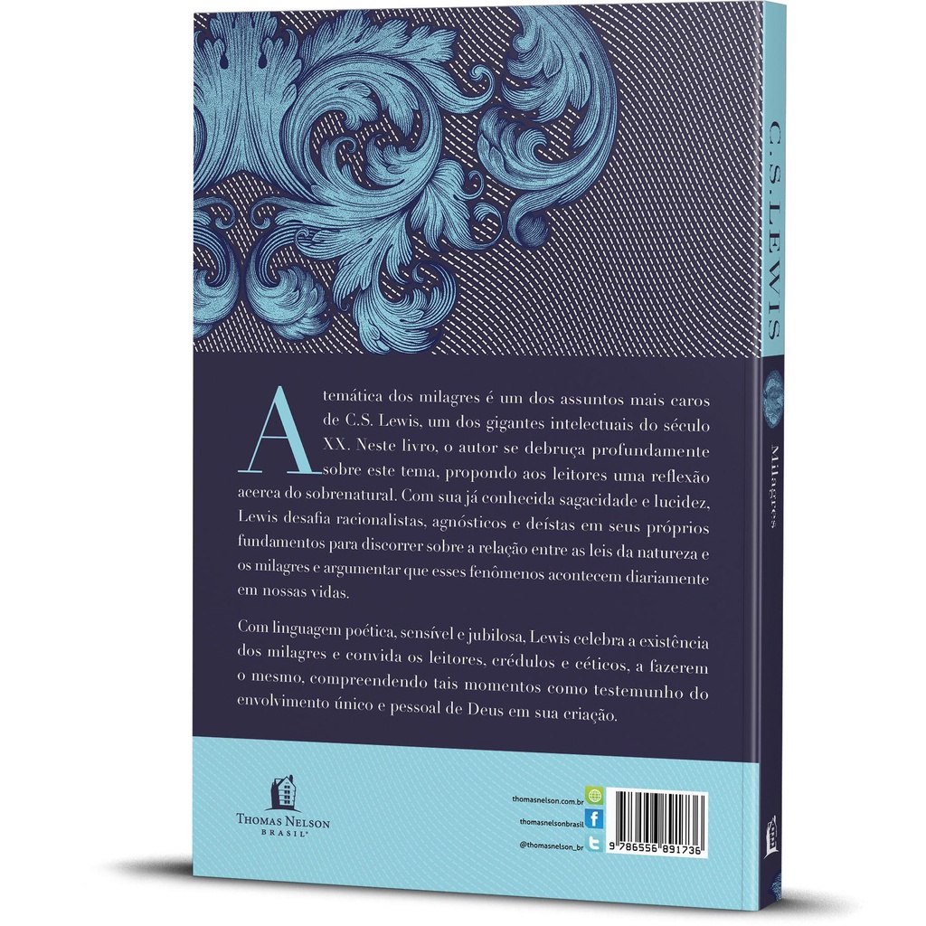 A temática dos milagres é um dos assuntos mais caros de C.S. Lewis, um dos gigantes intelectuais do século XX. Neste livro, o autor se debruça profundamente sobre este tema, propondo aos leitores uma reflexão acerca do sobrenatural. Com sua já conhecida sagacidade e lucidez, Lewis desafia racionalistas, agnósticos e deístas em seus próprios fundamentos para discorrer sobre a relação entre as leis da natureza e os milagres e argumentar que esses fenômenos acontecem diariamente em nossas vidas. Com linguagem poética, sensível e jubilosa, Lewis celebra a existência dos milagres e convida os leitores, crédulos e céticos, a fazerem o mesmo, compreendendo tais momentos como testemunho do envolvimento único e pessoal de Deus em sua criação.