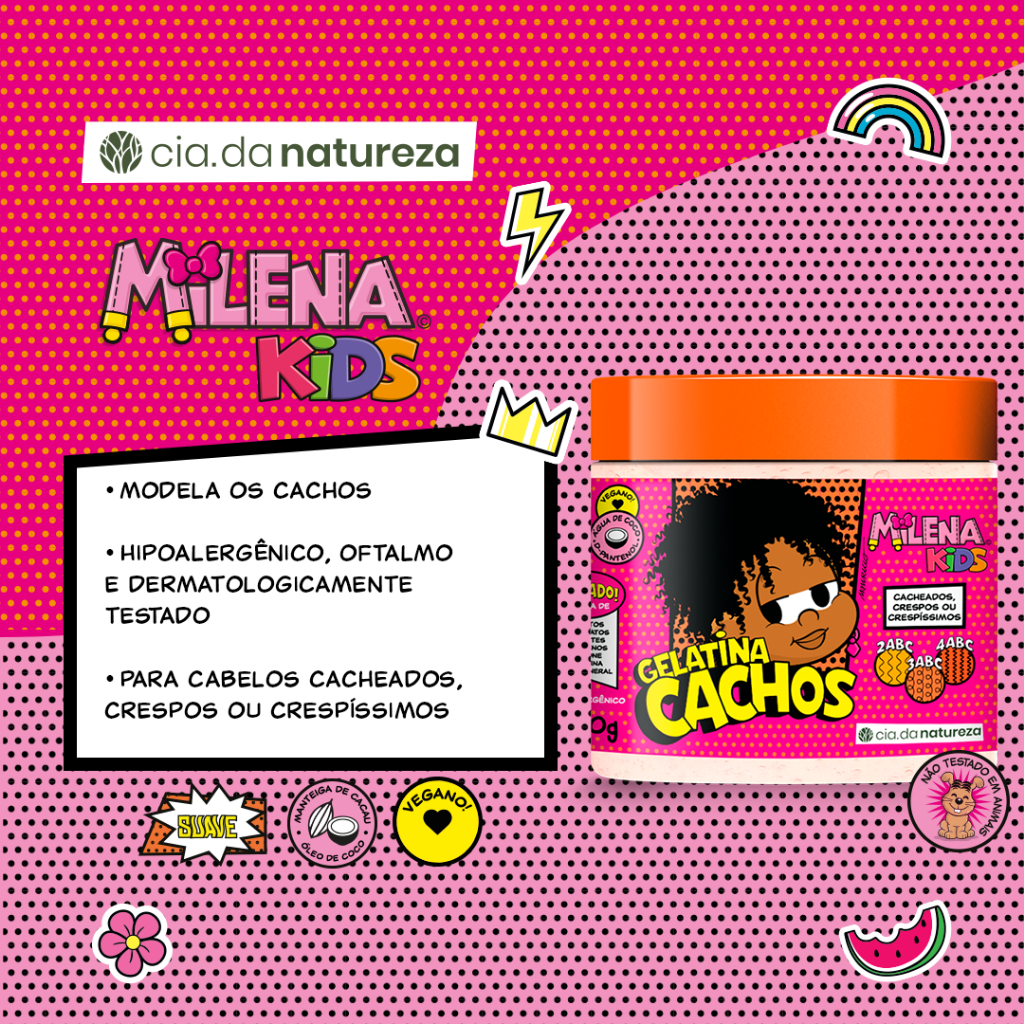 A linha Milena Kids da Cia. da Natureza foi inspirada na atitude e no estilo da nova personagem da Turma da Mônica. Sua fórmula suave, livre de ingredientes que agridem os fios e turbinada com ativos super hidratantes, foi desenvolvida para facilitar o dia a dia e empoderar com resultados incríveis os cabelos cacheados, crespos ou crespíssimos. A Gelatina Milena Kids ajuda a modelar e definir os cachos. Sua fórmula hidratante com Pantenol e Água de Coco ajuda no controle do frizz, controla o volume e ajuda a fixar os cachinhos garantindo um look incrível! Fórmula Liberada - nadinha de sulfatos, corantes, parabenos, óleo mineral, parafina, silicone Não testado em animais Hipoalergênico Dermato e Oftalmologicamente testado Vegano Pode ser usado pela mamãe MISTURINHA LIBERADA Pode ser misturada ao Creme de Pentear Milena Kids Com Pantenol e Água de Coco Volume e definição para os cachinhos e crespinhos