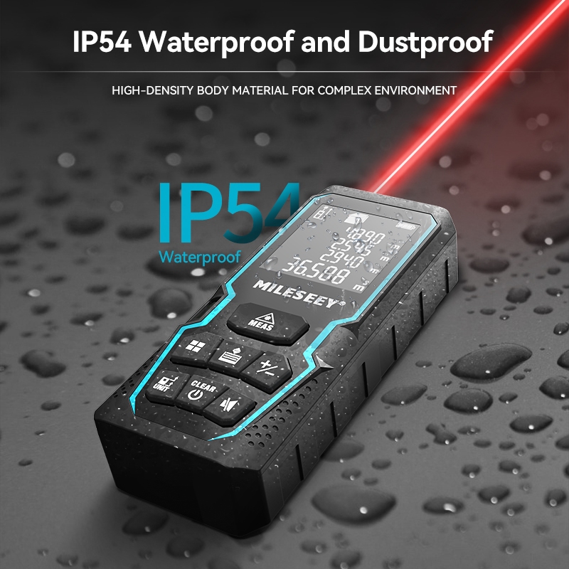 Mileseey Electronic Laser Measure Mileseey was established in 1998. With over 20 years of manufacturing and R & D experience in the measuring instruments industry, he works on technological innovation, product usability improvements, and the creation of more economical and stable solutions. Electronic Level Control Function: With the Electronic Level Control Function ,the angle of the inclination will display on the screen, which provides more precise measurement;With laser precision technology, accuracy ups to ±2mm, measuring distance extends to 120m; Switchable among M/In/Ft/In+Ft for free adjustment. LCD BACKLIGHT & MUTE SETTING: Large backlight screen provides you with a better visibility in dark areas; Mute setting allows you turn on or off the measure beep at your will, suitable for using in library, classroom and other quite places,the laser level is ideal for home, construction and industries, especially in large areas such as rooms, apartments, buildings, real estates, factories, warehouses, etc VERSATILITY: Angel(optional), area, distance, length, volume, continuous measurement, Pythagorean method-three points; Addition and subtraction; Low battery indication; 20 groups data memory; Manually delete data; Auto shut down after 150s without any operation to save power DURABLE AND PORTABLE DESIGN: IP54 waterproof level and dust-proof function protect the laser distance measure to the maximum extent; Portable size and hard rubber body provide a good grip; Wrist strap lets you hold the meter steady and carry easily. Measuring range: 40m, 50m, 70m, 80m, 100m, 120m Distance measurement precision: ±2mm Units: M/In/Ft/Ft+In Laser Level/Type: Class II/630-670nm, <1mW Historical Memory: 30 sets Auto Laser Off: 30 sec Auto Instrument Off: 180 sec Battery Life: 5,000 Measurement Times IP54 Waterproof and Dustproof The laser distance meter is made of rugged, wear-resistant material with IP54 protection, which makes it more durable and convenient to work in a variety of environments. Adjusting Measuring Reference The default reference setting is from the rear of the instrument. The reference point will be set to default every time when it's powered off, i.e. the measuring reference point is from the rear of the instrument every time when it's powered on. Electronic Angle Sensor Compared with the traditional physical liquid level bubble, the electronic Angle sensor can display the measurement Angle in real time, which makes it easy to find the horizontal direction, thus making the measurement data more accurate. 4 Units Conversion Press and hold the Units button for 2 seconds to freely change the units to M / In / Ft / Ft + in, which can meet your different measurement needs. Durable Spectroscopic Lens The laser measure uses a pectroscopic lens to provide fast measurements and great accuracy. This is a special free surface optics with high transmittance and high refractive index, which means you get all kinds of measurements