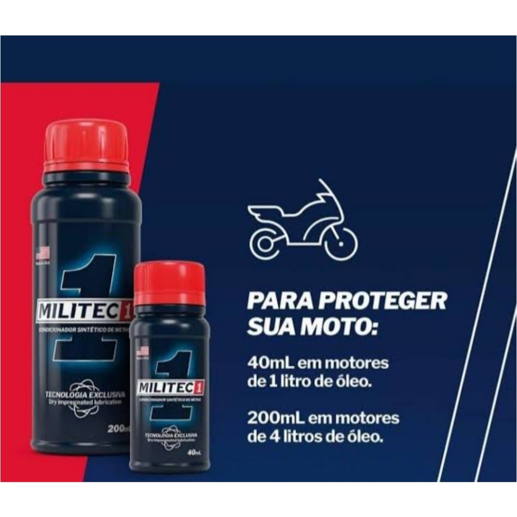 Militec1 o maior condicionador de metais do mundo. Eficácia 100% garantida. Produzido nos E.U.A. * NÃO EXISTE PRODUTOS IDÊNTICOS NO MERCADO!!!! Serve para moto e carro, prolonga a vida útil do motor e promove uma maior desempenho do veículo. Quando aplicado em seu veículo faz uma camada protetora em todos metais do motor, fazendo uma barreira protetora que evita o desgaste do motor. *APLICAÇÃO: (Basta apenas misturar no óleo do motor) *ACOMPANHA ETIQUETA DE MARCAÇÃO *MOTO BAIXA CILINDRADA (APLICAR A CADA 4.000KM) 1 litro de óleo - 40ml de Militec 2 litros de óleo - 80ml de Militec *MOTO ALTA CILINDRADA (APLICAR A CADA 10.000KM) 3 litros de óleo - 120ml de Militec 4 litros de óleo - 160ml de Militec *CARRO (COLOCAR A CADA 20.000KM) 200ml de Militec *DÚVIDAS VERIFICAR NA TABELA