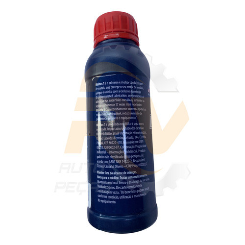 O que sabemos sobre Militec-1: A exclusiva tecnologia éster-clorado, desenvolvida em parceria com as forças armadas norte-americanas, faz do Militec-1 o único condicionador de metais do mercado. Quando aplicado, produz uma reação química que ocorre na presença de calor, que resulta em uma superfície metálica até 17 vezes mais rígida, mais lisa e menos porosa, reduzindo drasticamente o atrito e consequentemente o desgaste, AUMENTANDO ASSIM A DURABILIDADE DE QUALQUER EQUIPAMENTO MECÂNICO, seja motor, caixas de câmbio, reduções, diferenciais e etc. Aplicações e indicações: - Óleo de motor em veículos convencionais, 6% do volume do óleo. Em veículos para competição ou uso severo, dobrar a dose; - Motores 2 tempos: 60 ml por litro de óleo; - Diferenciais: aplique 3% sobre o volume do óleo lubrificante; - Sistemas hidráulicos: aplique 2% sobre o volume do óleo lubrificante; - Rolamentos: misture com a graxa na proporção de 10% de Militec-1 para 90% de graxa, misture bem e aplique nos rolamentos. Pode ser utilizado também em lavadoras de pressão, motosserras, motobombas, ferramentas pneumáticas, bicicletas, correntes de moto e em qualquer local onde se tem atrito metálico. Mais informações em: site Militec-1 Atenciosamente: equipe GF-Lub AUTOMOTIVE - ATENÇÃO Para garantia de AMORTECEDORES, só serão aceitas mediante apresentação do certificado enviado junto ao produto. Sem esse documento, não será possível efetuar a garantia do produto. Em caso do não recebimento do certificado, favor nos enviar assim que receber a mercadoria e notar a ausência.