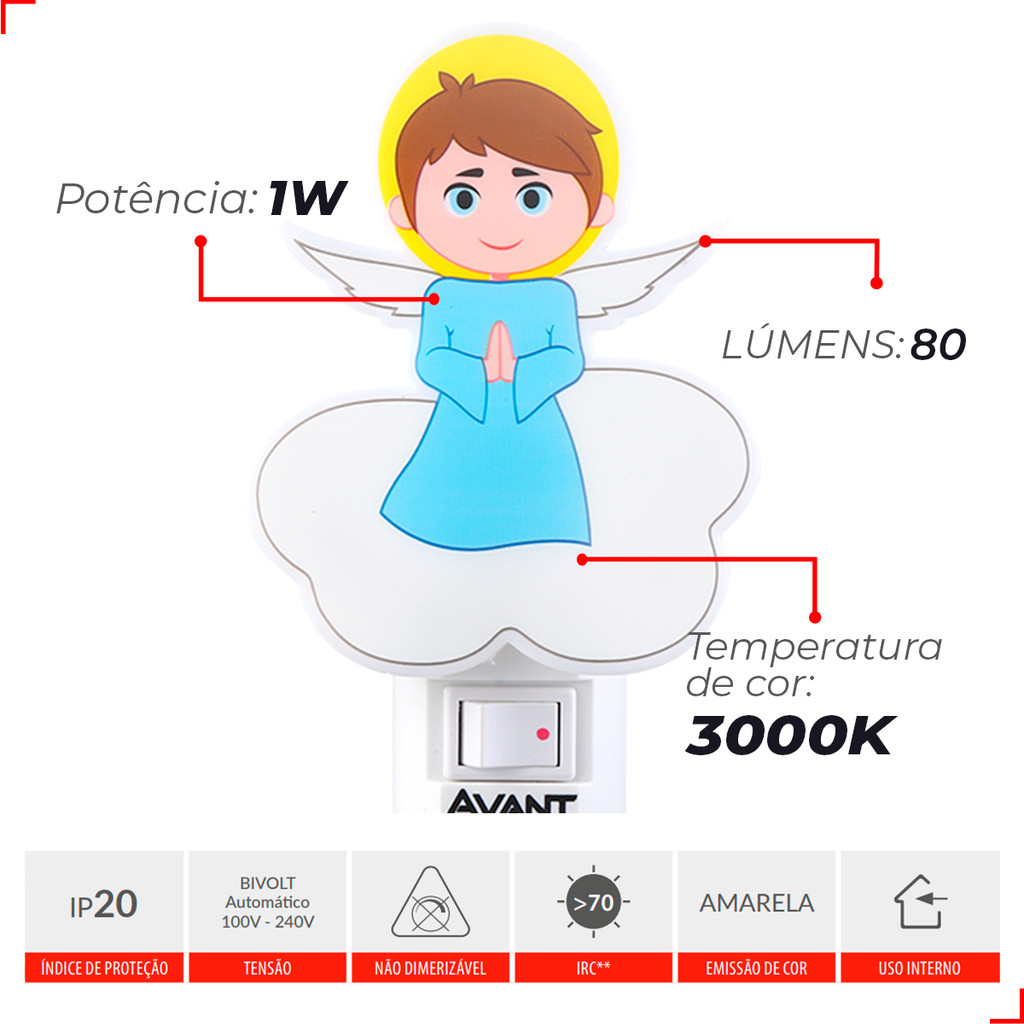 Ilumine a noite com a Luz Noturna Anjo da Avant. Perfeita para proporcionar segurança e conforto aos pequenos, essa luminária garante uma iluminação suave e agradável no quarto, ideal para criar um ambiente aconchegante e relaxante. PROPRIEDADES: Proporciona segurança e auxílio em locais que necessitam de uma pequena fonte de luz. Não emite infravermelho e ultravioleta. Produto não tóxico. Composição livre de mercúrio. Baixo consumo de energia. CARACTERISTICAS DE FUNCIONAMENTO: Tensão de entrada: 100V a 240V. Fator de potência: >0,50. Bivolt Automático (100V-240V) ESPECIFICAÇÕES TÉCNICAS E COMERCIAIS: Potência: 1W Fluxo Luminoso: 80 lm Emissão de Cor: Amarela Temperatura de Cor: 3000K IRC: >70 Uso: Interno Garantia Oficial Avant de 12 meses para defeitos de fabricação. Sobre a Avant: A Avant, marca reconhecida por sua qualidade e inovação, oferece uma ampla variedade de produtos para iluminação, com foco em design, funcionalidade e segurança. Com a missão de iluminar os momentos mais importantes da vida, a Avant se dedica a oferecer soluções inteligentes e eficientes para todos os ambientes.