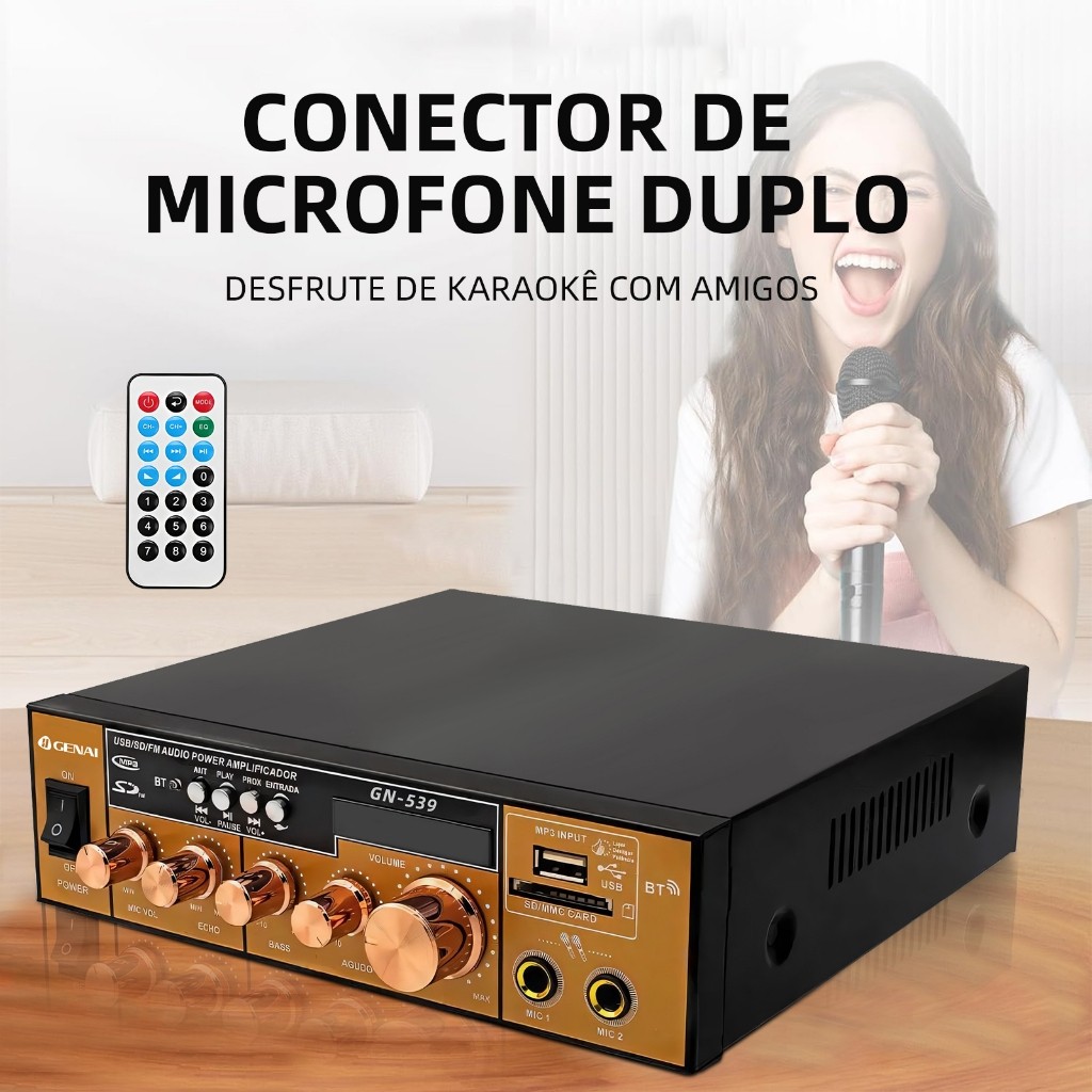 ✨✨Medidas: 20cm x 20cm x 6,5cm Saídas de áudio: 2 Conexão sem fio: Bluetooth Entrada para microfone: Sim 2x P10 Entradas Aux: 2x RCA Conexões: Pen drive / Cartão SD Rádio FM: Sim Controles frontais: Grave / Agudo / Volume / Volume microfone Voltagem de entrada: 110v (pode ligar em 220v usando um fonte 12v *não inclusa) Alimentação auxiliar: 12v/5A 📦Itens inclusos: 1x Amplificador 1x Controle remoto 1x Manual de instruções Posicionamento central: amplificación de son de nivel profesional, solución de son multiescenario ✅Este amplificador de son GENAI, centrado na "alta calidade" e integrado en múltiplas funcións, é o centro de son ideal para vídeos domésticos, pequenos espectáculos e cancións K casuais, proporcionando unha audición clara e impactante. Parámetros de rendemento: configuración do núcleo duro, voz forte ✅Sensibilidade de entrada: Soporta entradas de amplo rango de 0,25 mV a 220 mV e é compatible con varias fontes de son, desde sinais débiles ata dispositivos de saída fortes. ✅Integración de funcións: USB, reprodución de tarxetas SD, radio FM en un só, tamén ten a función de conexión Bluetooth, o acceso a fontes de son é flexible e variado, para satisfacer as súas múltiples necesidades de música e radio. ✅Funcións destacadas: conmutación multimodo, fácil de manipular ✅Conexión Bluetooth: Compatible con emparellamento sen fíos Bluetooth, móbiles, tabletas e outros dispositivos poden conectarse facilmente e gozar de transmisión de música sen fíos en calquera momento. ✅Canal de micrófono duplo: con interface de micrófono "CANAL 2", soporta dúas cancións K simultáneas, festas familiares e pequenas festas en vivo KTV. ✅Reprodución de tarxetas SD e discos U: Soporta lectura directa de tarxetas TF (CARTAO DE MEMORIA SD) e discos U para reproducir ficheiros de audio locais sen requirir dispositivos adicionais. Control remoto de infravermellos: equipado con "CONTROLE REMOTO", pode axustar o volume a distancia, cambiar a fonte de son, controlar a reprodución, para operar con máis eficiencia. ✅Adaptación de escena: cubre toda a área do entretemento de vídeo Cine en casa: Conecta TV e son para crear un sistema de vídeo en casa inmersivo, con películas e unha calidade de son variada. K Song Entertainment: Twin Channel + volume, botón de axuste de son para que as cancións K de casa teñan o rendemento de son de KTV profesional. ✅Escoita diariamente: reproduce a música favorita a través de Bluetooth e tarxetas SD e goza dunha festa de música de alta fidelidade con altavoces de estante. Pequenos eventos: en tendas, salas de reunións, etc., pode servir como núcleo de amplificación de son para transmitir voz e música claramente. ✅Marca e deseño: calidade GENAI, apariencia clásica Como dispositivo de audio de GENAI, continúa a rigorosa busca da marca pola calidade do son. A combinación clásica de cor oura negra + botóns de textura metálica non só é intuitiva, senón que engade unha atmosfera de vídeo profesional ao seu espazo. Escolla este amplificador de son de alta calidade GENAI, xa sexa para o son de cine ou para as cancións K de casa, que se converten no seu socio central de entretemento de son con características potentes e excelente calidade de son, facendo de cada escoita unha festa auditiva.