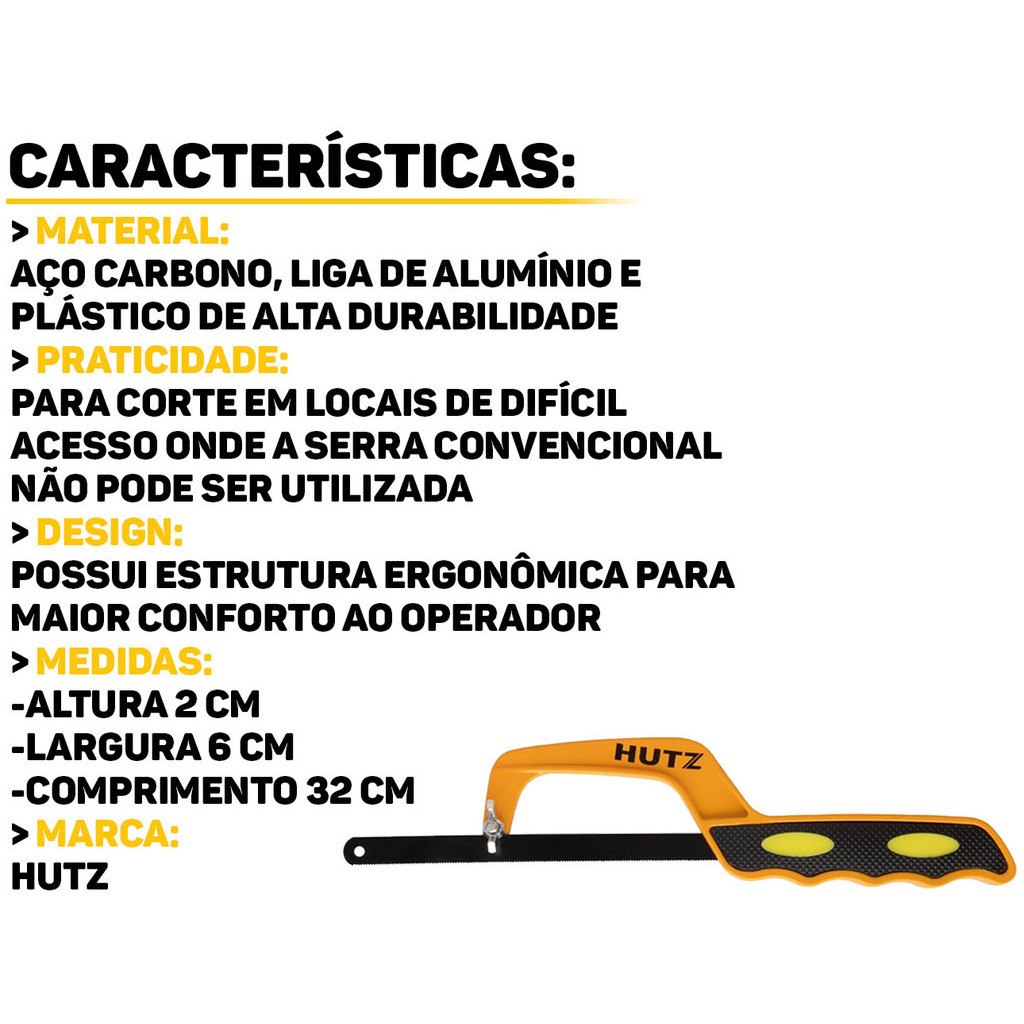 Mini Arco De Serra 10" Hutz Com o Mini Arco de Serra 10" Hutz, você terá em mãos uma ferramenta que simplifica seus cortes, seja em madeira, plástico ou metal leve. Feito com materiais de alta qualidade, oferece durabilidade e resistência para acompanhar suas demandas diárias. É a escolha ideal para projetos de marcenaria e trabalhos DIY. Características: > Material: aço carbono, liga de alumínio e plástico; - Marca: Hutz - Garantia: 90 dias contra defeitos de fabricação Vantagens de comprar na Brester: - Produto a pronta entrega. - Produto novo, com garantia de fábrica. - Nota fiscal para Pessoa Física e Pessoa Jurídica.