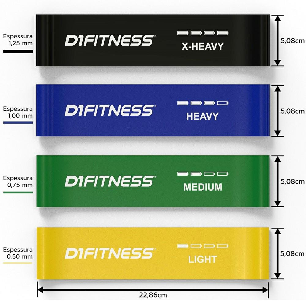 Mini Band Extra-Forte - 10 unidades Transforme Seu Treino com as Mini Bands D1FITNESS! As Mini Bands D1FITNESS são elásticos versáteis, ideais para correção postural, fortalecimento muscular e melhora da estabilidade corporal. Com 9" (22,86 cm) de comprimento e 2" (5,08 cm) de largura, essas faixas elásticas ativam de forma eficaz os estabilizadores do quadril e da cintura escapular, contribuindo para a redução de dores em joelhos, coluna e ombros. Disponíveis em 4 níveis de resistência, diferenciados por cor, você escolhe a faixa que melhor se adapta ao seu treino: Amarelo - Leve (0,5 mm) Verde - Média (0,75 mm) Azul - Pesado (1,00 mm) Preto - Extra-Pesado (1,25 mm) Benefícios das Mini Bands: Corrige, melhora e aumenta a estabilidade do centro do corpo e dos segmentos corporais (braços, pernas e core) Ativação significativa dos estabilizadores do quadril e da cintura escapular Ajuda na diminuição de dores em joelhos, coluna e ombros Ideal para treinos corretivos, resistência e fortalecimento Cuidados e Recomendações: Ao colocar ou retirar as Mini Bands para exercícios nos membros inferiores, evite o contato com a sola do tênis. Para braços: use Mini Band amarela ou verde; para pernas: prefira azul ou preta. Não pise na faixa com o tênis ou use descalço para evitar danos. Permita extensão máxima de 20 cm para maior segurança e durabilidade (comprimento sem tensão: 22,86 cm / sob tensão máxima: 44,86 cm). Caso precise de mais resistência, escolha uma faixa de maior intensidade. Garantia do Produto: Verifique todas as tiras ao receber o produto. Qualquer dano identificado deve ser comunicado no dia do recebimento, pois a garantia é válida apenas nesse período. Problemas identificados após o uso serão considerados decorrentes do uso inadequado. Potencialize seus treinos e alcance melhores resultados com as Mini Bands D1FITNESS! Adquira já seu conjunto de Mini Bands Extra-Forte e transforme sua rotina de exercícios.