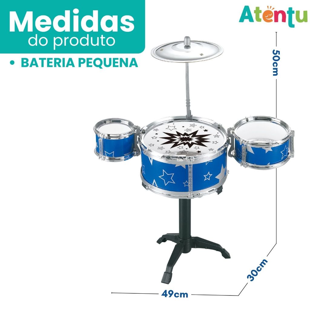 MINI BATERIA MUSICAL INFANTIL - ATENTU Incentive o talento musical do seu pequeno com a Mini Bateria Infantil! Um brinquedo educativo e interativo que desperta o amor pela música, estimula a criatividade e aprimora a coordenação motora de forma divertida. ESPECIFICAÇÕES: * Acompanha baquetas * Banquinho ergonômico * Três tambores (Bateria pequena) * Cinco tambores (Bateria grande) * Duas variações de cor Vermelho/Azul * Certificação INMETRO: 007616/2024; * Marca: ATENTU. CONTEÚDO DA EMBALAGEM: * Bateria pequena desmontada; * Manual de montagem. MEDIDAS DO PRODUTO: BATERIA PEQUENA (NÃO ACOMPANHA BANQUINHO) * (CxAxL) 49x50x30 cm BATERIA GRANDE (ACOMPANHA BANQUINHO) * (CxAxL) 71x62x32 cm IMPORTANTE: * Garantia: 3 Meses a partir da data de recebimento - para defeitos de fabricação (não cobrimos mau uso). *Todos os Direitos Reservados Em caso de cópia dessa descrição e fotos, os responsáveis serão cobrados de acordo com a Lei (9.610/98) de Direitos Autorais.*