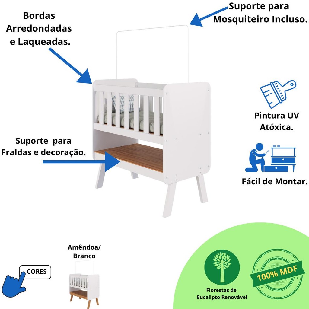O Mini berço Faura é um produto padrão especial, fabricado 100% em MDF e possui pintura atóxica. Seu estrado possui altura fixa e é fabricado em MDF e madeira/laminado de madeira. As grades são fabricadas em chapas de 25 e 12 mm e as cabeceiras são em chapa de 9 mm. As grades possuem bordas arredondadas e laqueadas, enquanto as cabeceiras possuem bordas pintado em PU, tudo proporcionando maior segurança e uma sensação agradável ao toque. Acompanha colchão suporte de cortinado. - Manual de Montagem: Manual segue na embalagem do produto - Os entregadores não estão autorizados a subir escadas ou elevadores, realizando a entrega apenas na recepção ou portaria, conforme as normas trabalhistas dos transportadores. Recomendamos que os clientes considerem essa limitação ao realizar suas compras. - Imagens meramente ilustrativas: a decoração não acompanha o produto. - Recomendações de Uso, Manutenção e Limpeza: Para limpeza utilize somente pano limpo e macio, ligeiramente umedecido em água, seguido de um pano seco. Ficha Técnica -Mini Berço Faura Dimensões do Mini Berço montado: Altura 91,5cm x Largura 86,8cm x Profundidade: 50cm Dimensões sugeridas para o colchão: Comprimento: 84cm x Altura 7cm (Máximo permitido) x Largura 41,3 (Acompanha colchão) Perguntas Frequentes: A - É fácil montar o Mini Berço Faura? Sim, é fácil. Ao abrir a embalagem pode parecer complicado, mas é só seguir o passo a passo no manual de montagem que você consegue! Caso você entenda que não terá condições de realizar a montagem, recomendamos contratar um montador profissional na sua cidade. Nós não realizamos a montagem e não oferecemos esse serviço. B- Quais as cores disponíveis para o Mini Berço Faura? Temos nas cores; Branco Brilho e Amêndoa/Branco.