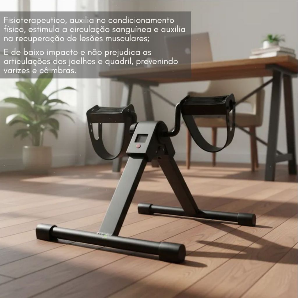Pedal ergométrico manual: este aparelho compacto com pedal cabe embaixo de uma mesa, para que você possa queimar calorias enquanto trabalha no escritório ou assiste TV. Basta dobrar este equipamento de treino de pernas para facilitar o armazenamento quando não estiver em uso. Com uma tela de funções: o painel digital desta bicicleta ergométrica dobrável exibe o tempo, a contagem de rotações, as rotações por minuto e as calorias queimadas. Essa tela de fácil leitura se alterna automaticamente por meio de um recurso sofisticado de digitalização. A configuração de baixa tensão é perfeita quando usada como equipamento de fisioterapia, enquanto a maior resistência é ótima para treinamento de tonificação e força. Você também pode usá-la em uma mesa para exercícios de tonificação dos braços. Peso – 2.4kg medidas dobrado 49x10x41cm Medidas 52 x 22 x 44Cm A tela requer uma pilha. Não é necessário montar. APLICAÇÕES: Utilizado para exercitar e reabilitar braços e pernas, sendo uma opção para idosos e pessoas em processo de fisioterapia para as pernas. Vantagens: • Transporte fácil • Dobrável • Ocupa pouco espaço • Leve e de fácil manuseio • Utilização em diversos ambientes – não produz ruídos • Estrutura metálica com acabamento em pintura Eletrostática • Pedais com tiras em borracha para segurança e conforto • Regulagem de força acionada por aperto • Confeccionado em Aço carbono de alta qualidade • Contador digital de giros, tempo de exercício e calorias queimadas