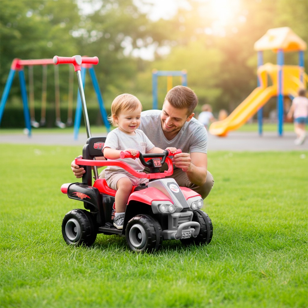 Aumente a diversão e a criatividade das suas crianças com o Quadriciclo da Unitoys! Este incrível veículo elétrico infantil foi projetado para proporcionar momentos inesquecíveis de diversão, estimulando a imaginação e a independência dos pequenos. Possui um empurrador direcional, o quadriciclo garante uma condução segura e fácil, permitindo que as crianças se sintam verdadeiramente no controle de suas aventuras. O Quadriciclo possui uma bateria de 6V, oferecendo uma excelente autonomia para que as crianças possam explorar e brincar por horas a fio. Com sons, músicas e farol com luzes adicionam um toque especial. O quadriciclo é equipado com rodas em plástico reforçado, garantindo durabilidade e resistência. A base para os pés permite que as crianças se sintam seguras enquanto se divertem. Com capacidade de até 30 kg, este veículo é perfeito para crianças em fase de crescimento, sendo uma excelente opção de presente. Adquira agora o Quadriciclo e proporcione momentos de pura alegria e diversão! Ideal para passeios em parques, quintais ou em casa, este veículo elétrico infantil é a escolha perfeita para as pequenas aventureiras que adoram explorar o mundo ao seu redor. CARACTERÍSTICAS: - Possui base para os pés - Rodas em plástico reforçado - Faról com luzes funcionais - Com sons e música - Modo elétrico e modo passeio - Com empurrador direcional ESPECIFICAÇÕES: - Recomendado para crianças de 2 a 5 anos - Dimensões aproximadas da embalagem (CLA): 72 x 42 x 35 cm - Dimensões aproximadas do produto (CLA): 75 x 42 x 90 cm (altura com a haste) - Contém: 01 Quadriciclo Elétrico, 01 Carregador, 01 Manual - Bateria de 6V - Motor de 380W - Suporta até: 30 kg - Tempo de carregamento: 8-12 horas - Tempo de autonomia: 1-2 horas - Carregador bivolt (100/240V) - Material: Plástico - Marca: Unitoys - Referência: 3007 - Número de registro/certificação INMETRO: 3038/2021 ATENÇÃO: As cores e detalhes podem variar de acordo com o lote de fabricação em relação às imagens apresentadas.